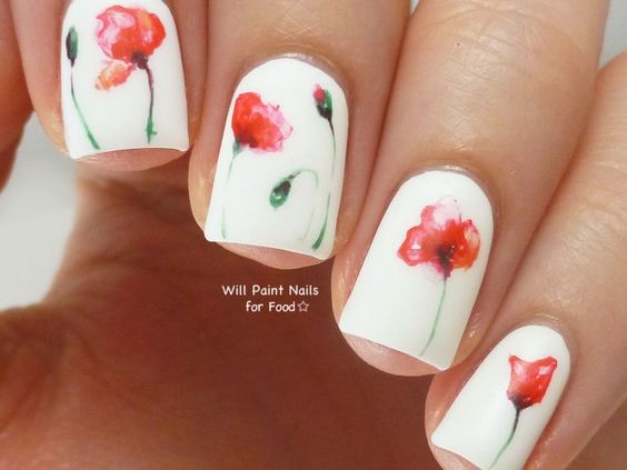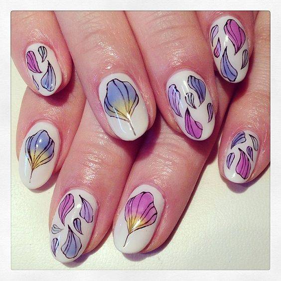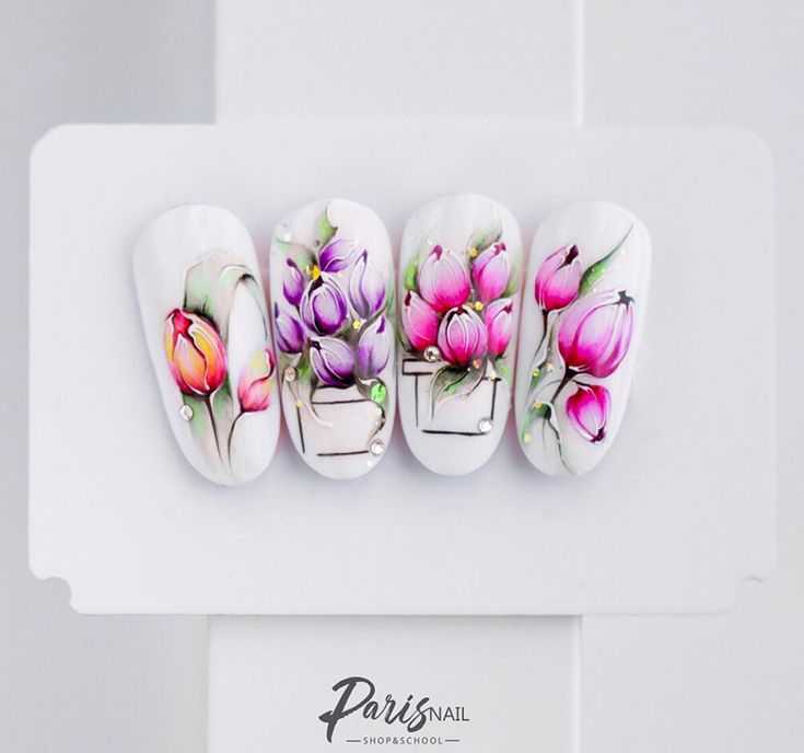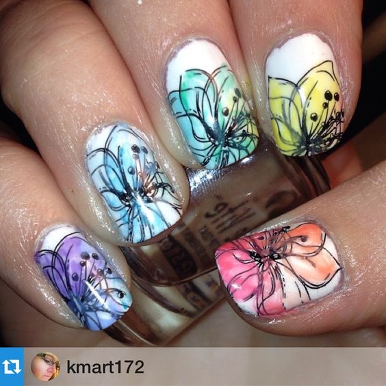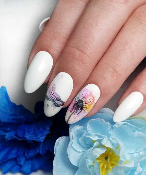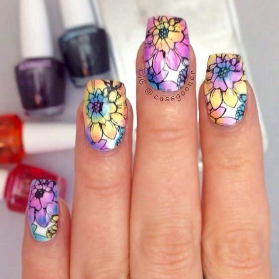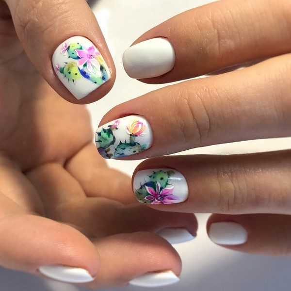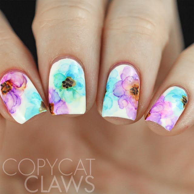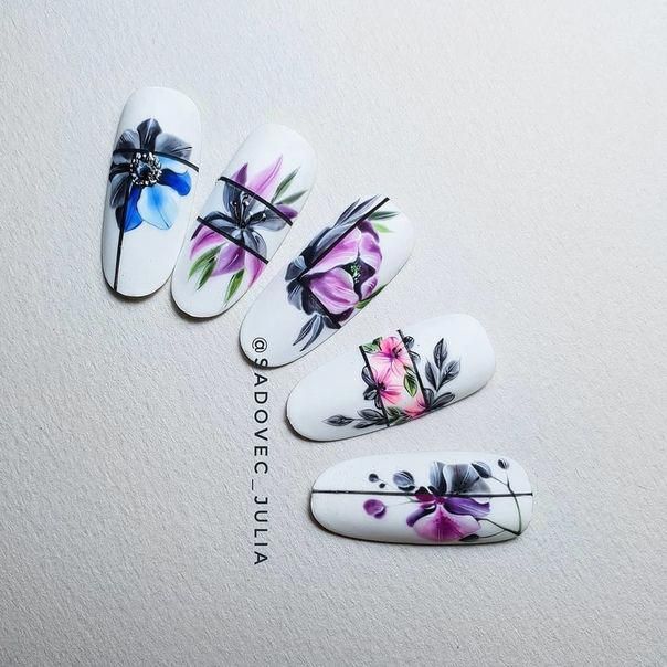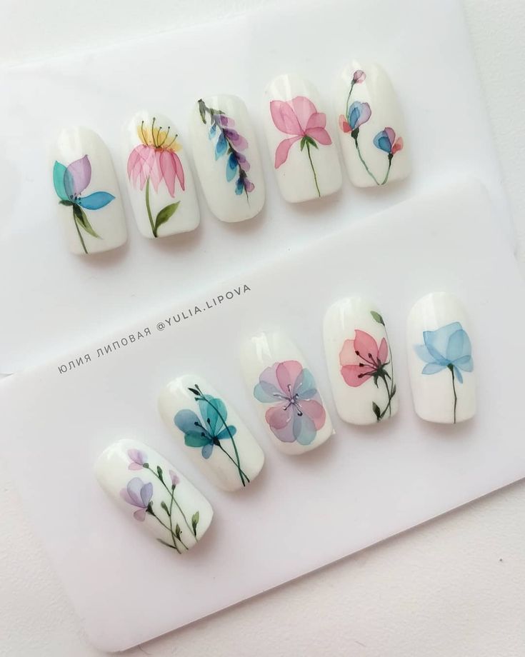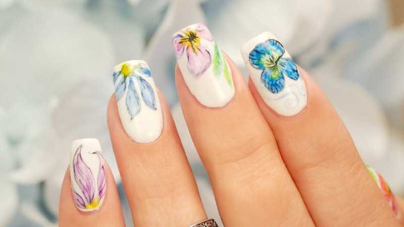 Нарисуйте несколько красивых цветов на ногтях в стиле акварели. Используйте белый лак в качестве фона и размытые цвета для самих цветов и листьев, такие как желтый, сиреневый и зеленый.