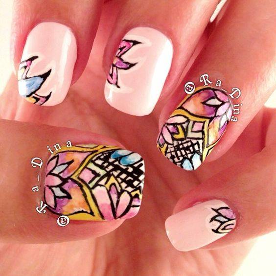 Придайте солнечный свет вашим ногтям с помощью этого красивого акварельного дизайна ногтей на матовой основе. Объедините солнечные цвета, такие как оранжевый, желтый, голубой, красный и зеленый. Рисунок нанесите на нюдовой основе на безымянном пальце и мизинце.
