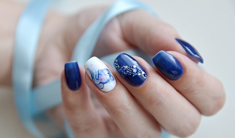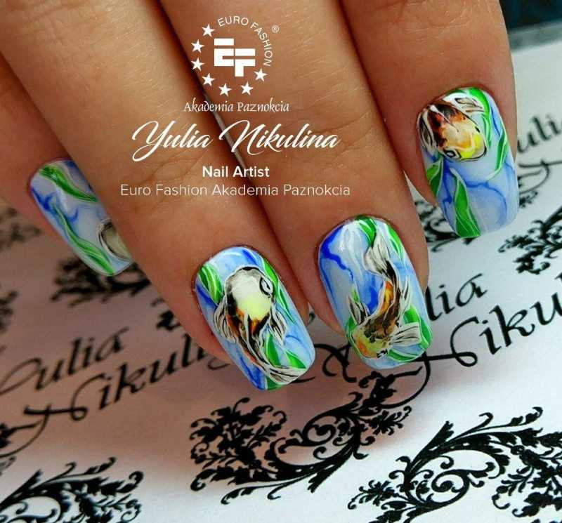 Для того что б сделать аквариумный маникюр на ногтях нужно помнить, что не стоит выбирать слишком объемные дизайны и крашения.