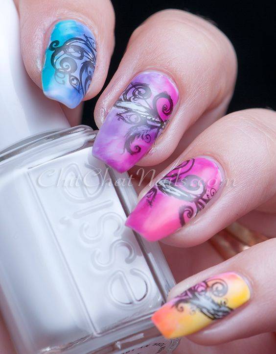 Если эта техника кажется вам слишком сложной, есть альтернативные варианты. Прежде всего, речь идет о готовых изображениях, которые представлены в виде дизайнов слайдеров или стикеров. С их помощью можно нанести рисунок симметрично или выбрать определенную его часть. Кроме того, наклейки часто используются для того, чтобы сделать акварельный маникюр в стиле луны. Всего несколько стразов или блесток – и дизайн будет выглядеть необычайно красиво.