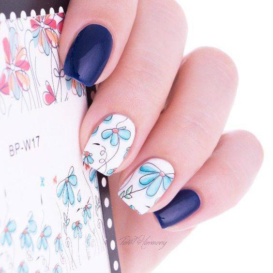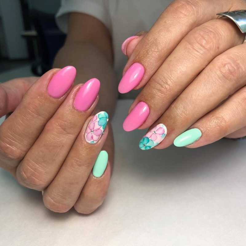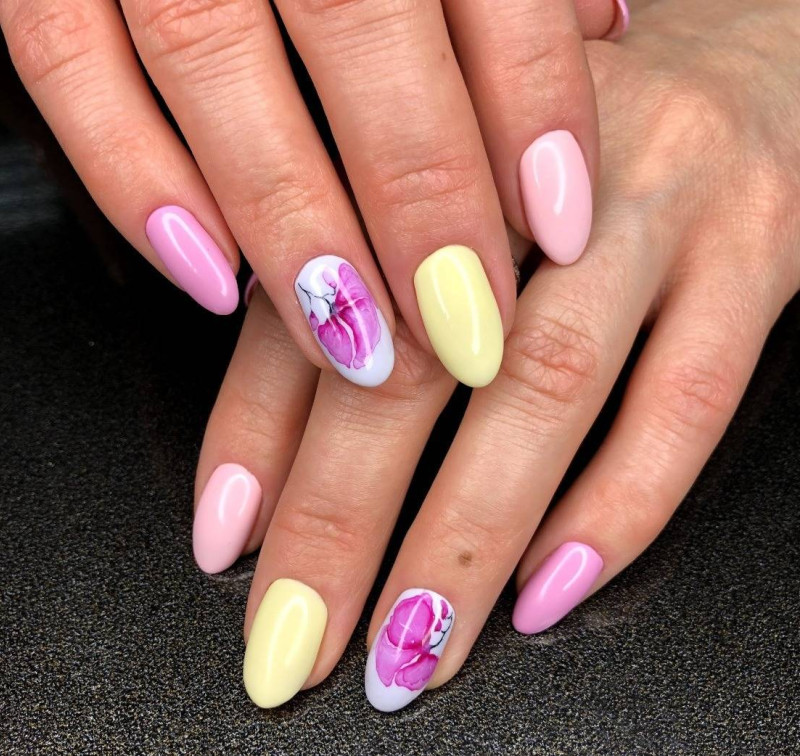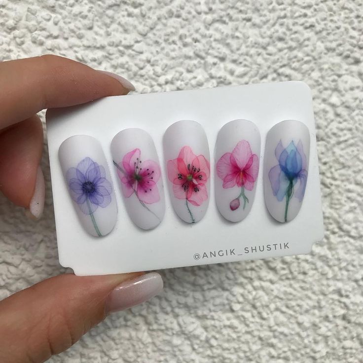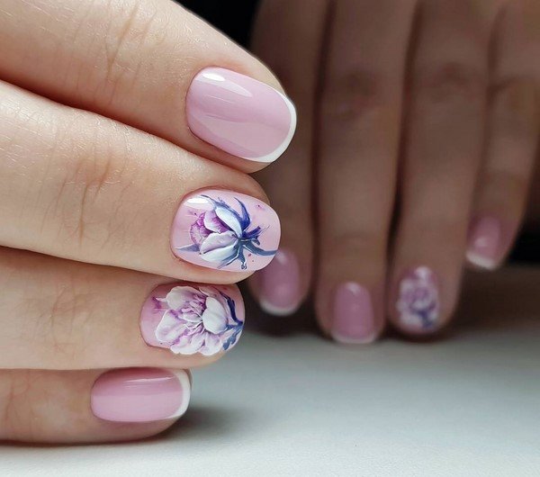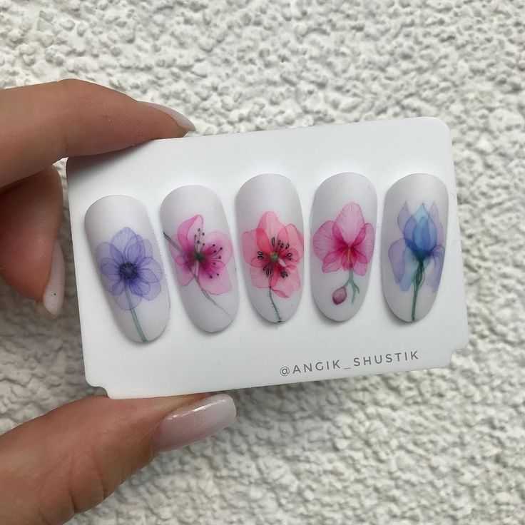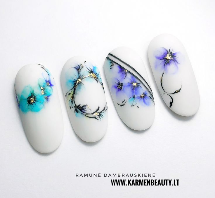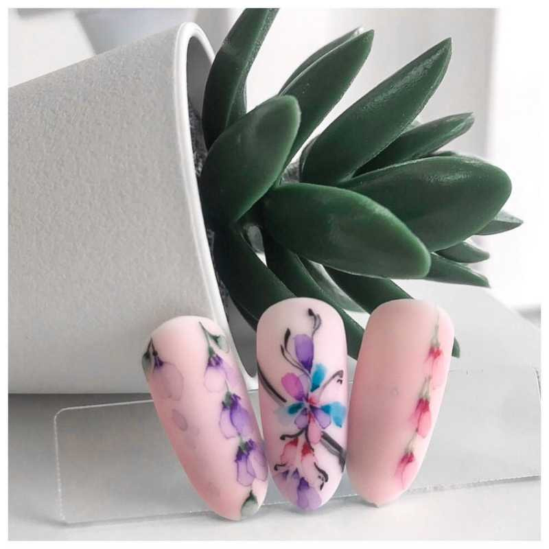 На протяжении многих лет цветочный принт является едва ли не самым популярным видом дизайна ногтей. Он используется в качестве французского декора, однотонного покрытия и многих других вариантов дизайна. Поэтому неудивительно, что цветы все чаще используются в технике акварели. Это позволяет смешивать оттенки в правильных пропорциях для получения нужных тонов. Примечательно, что эта техника не требует нанесения нескольких слоев краски. Самое главное – применять их аккуратно, без перерывов.