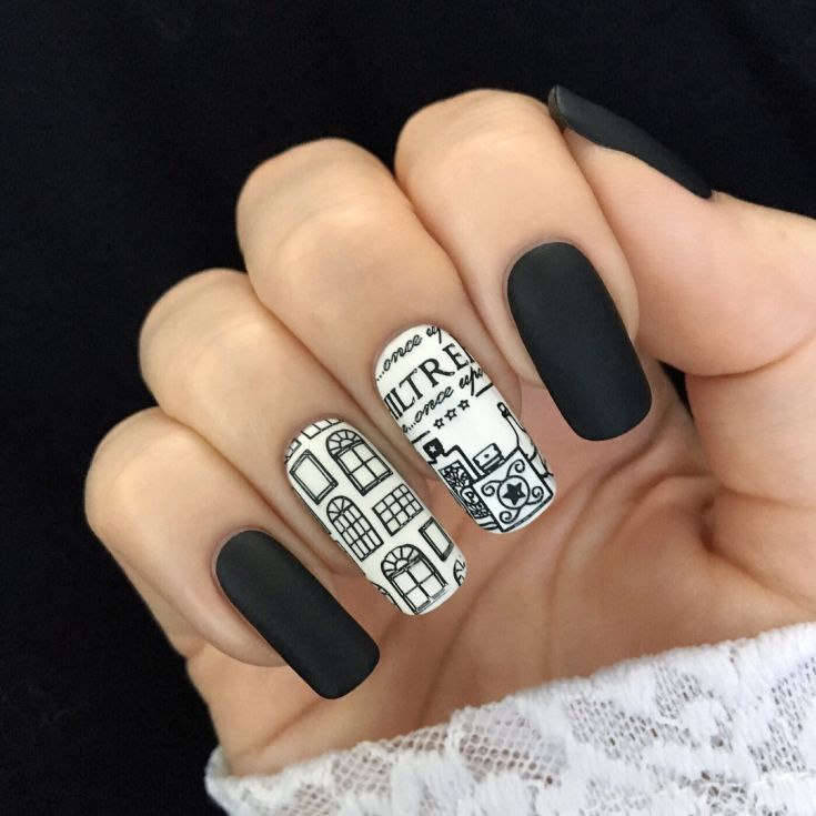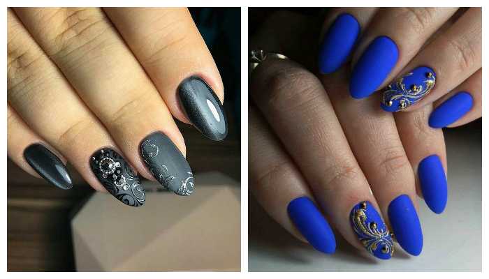 Например, в качестве основного фона выбираем матовый гель черного цвета, а один из пальчиков украшаем по душе. Такие ногти не будут создавать ощущения перебора и будут радовать вас до самой коррекции.