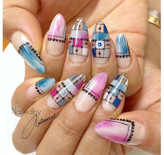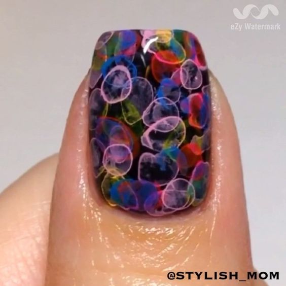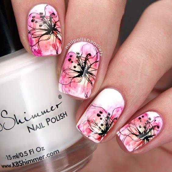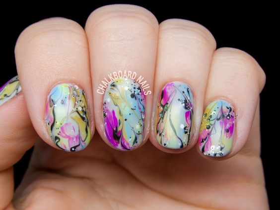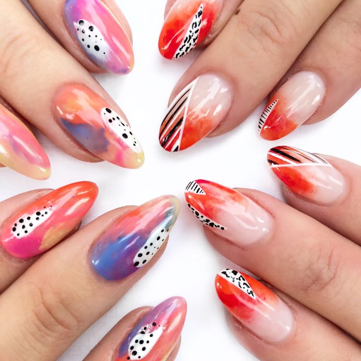 Сначала сделайте яркие хаотичные пятнышка на каждом из ноготков, потом нанесите легкие штрихи с помощью черной акварели. Этот нейл-арт выглядит очень красиво и модно, особенно в матовом топе.