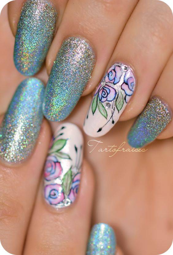Просто завораживающий рисунок в акварельной технике поверх блесток (блестки должны быть плотными). В этом маникюре красиво подобраны базовые оттенки и сам рисунок тоже сделан со вкусом.