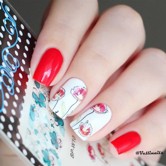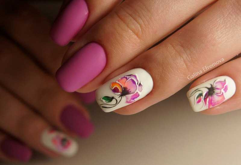 Начните с белого базового лака в качестве основы и на двух ноготках добавьте краски в виде ярких красивых цветов. Сочетание белого лака с фиолетовым выглядит очень красиво и стильно!
