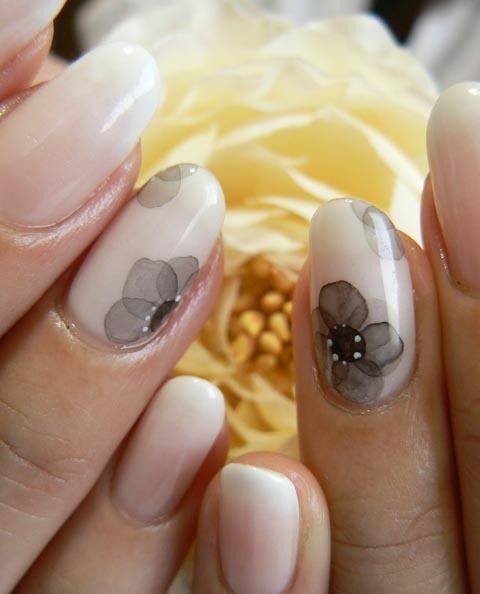 Безукоризненный маникюр на короткие ногти в бело-сером дизайне. Используйте белый лак в качестве основы для нанесения рисунка. Рисунок делайте размытым (дымчатым), можно еще добавить несколько штрихов в виде веточек.