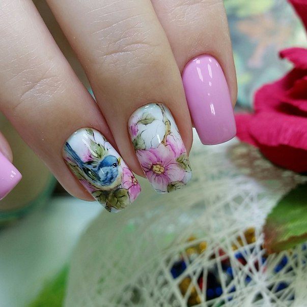 Белый лак — один из лучших для маникюра в технике акварель, и эта замечательная яркая птичка шикарно выглядит на белом фоне.
