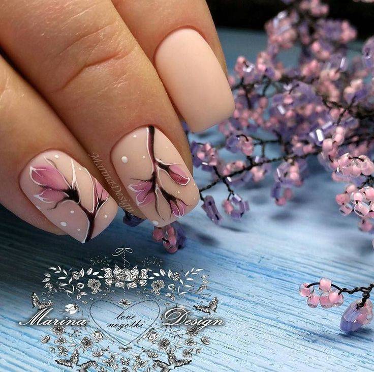 Веточки, разводы тоже очень интересно смотрятся в акварельной технике, можно создать целый шедевр. В этом маникюре очень красивое сочетание цветов и переходов на нюдовой основе.