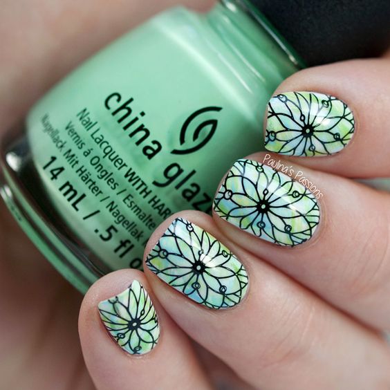 - Нанесите краску на фольгу или палитру и очень тонкой кистью создайте желаемый рисунок на ногте. Если вы хотите размыть пигмент, окуните кисть в обезжириватель перед нанесением краски.