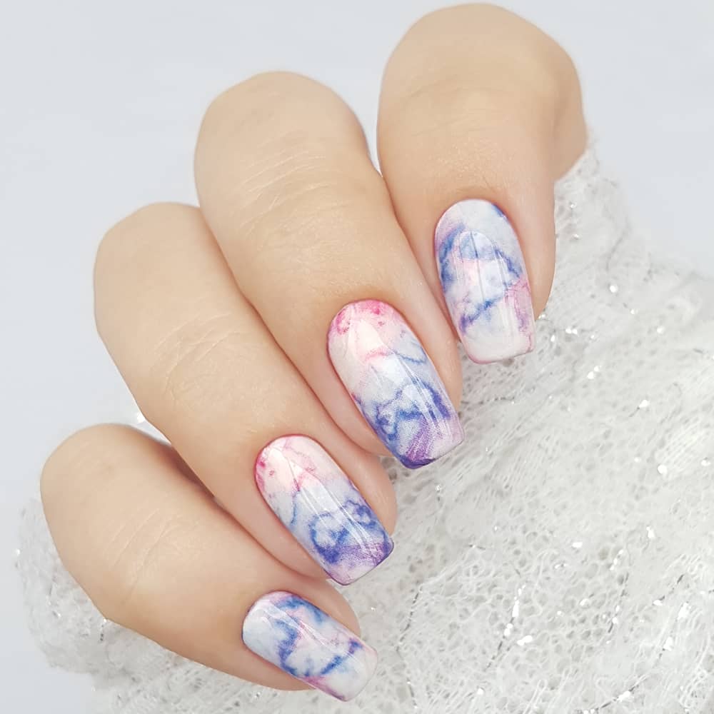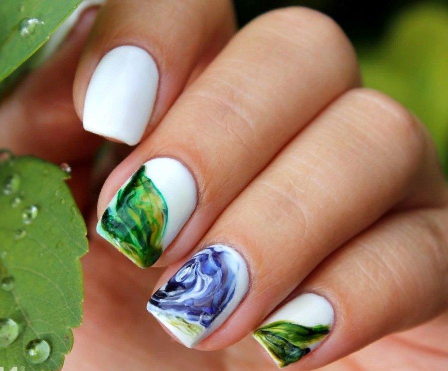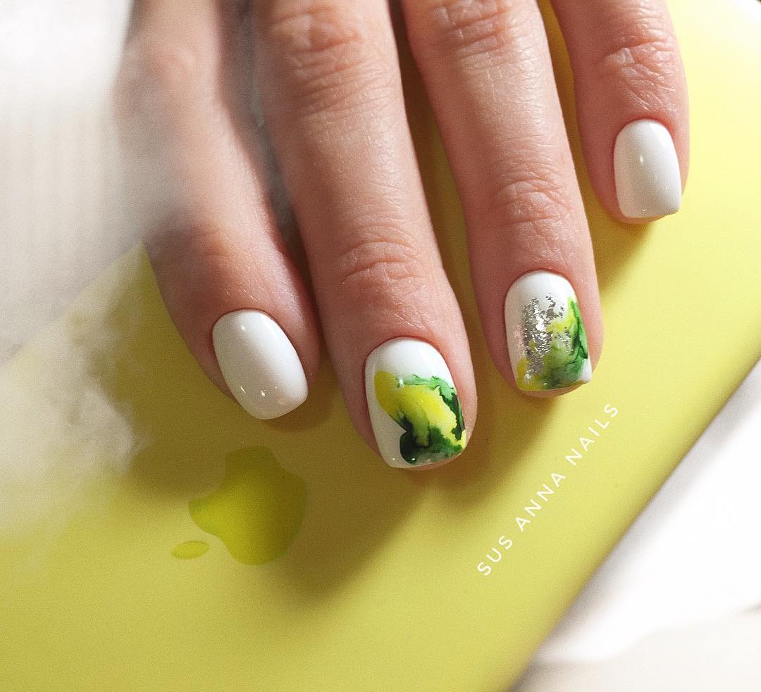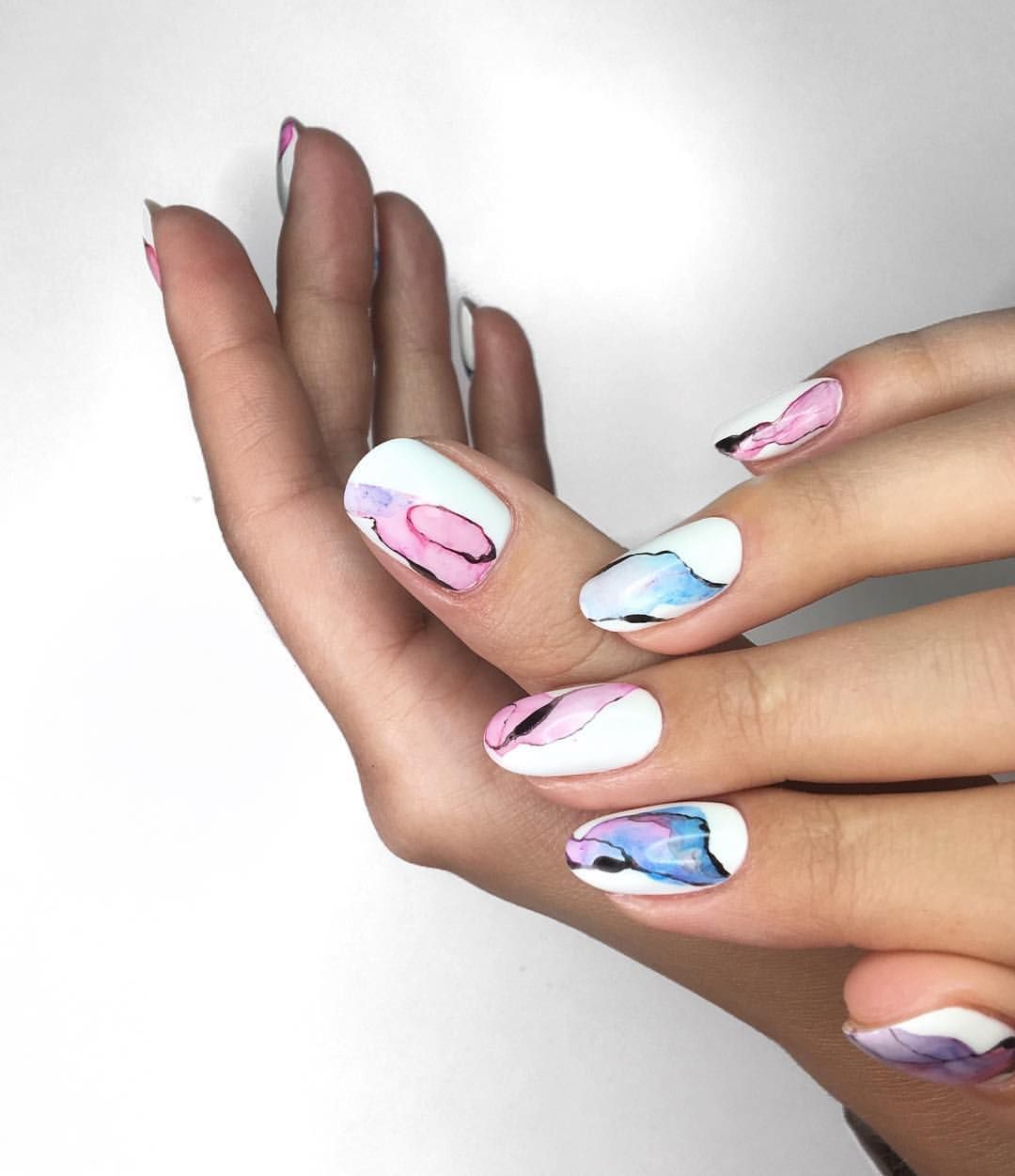 Белый маникюр с пятнами подойдет к любому образу. В зависимости от цвета можно получить как повседневный маникюр, так и праздничные дизайны.