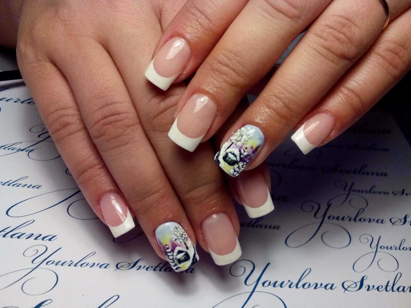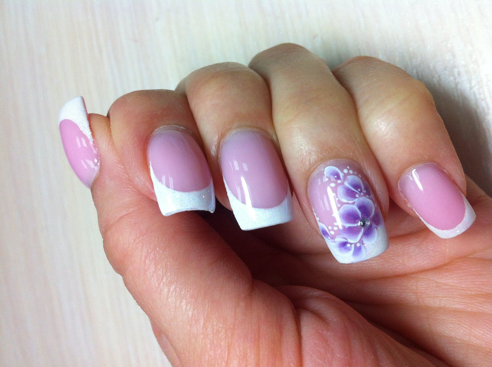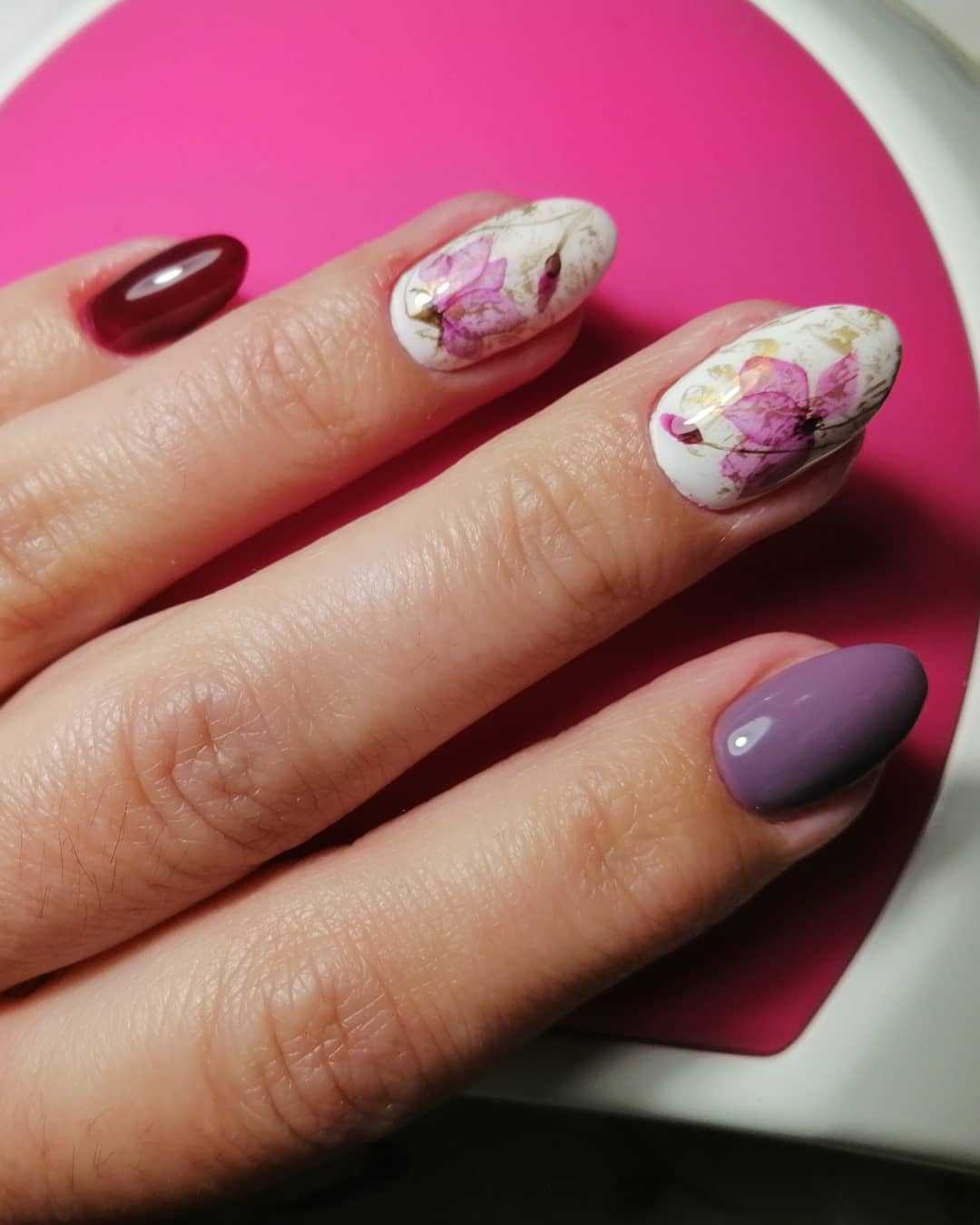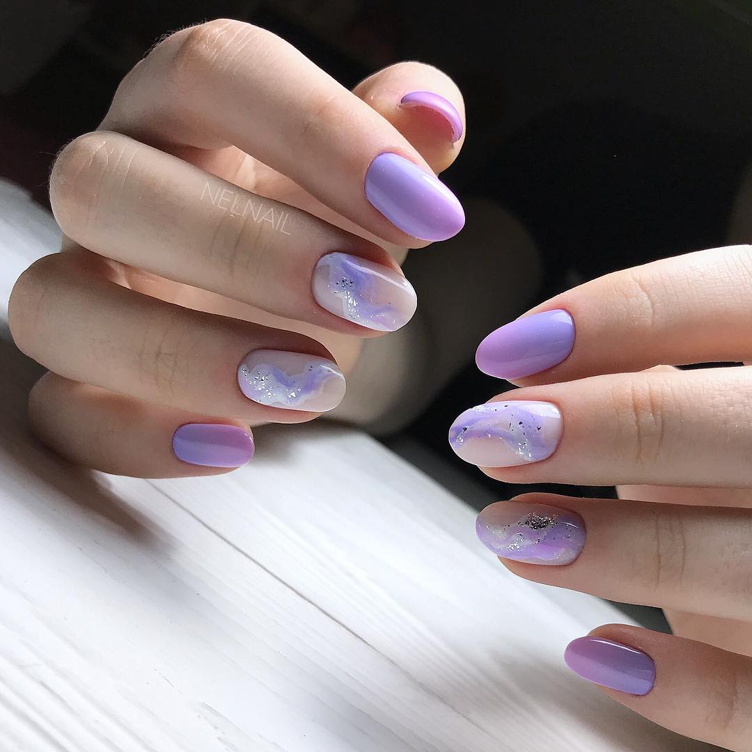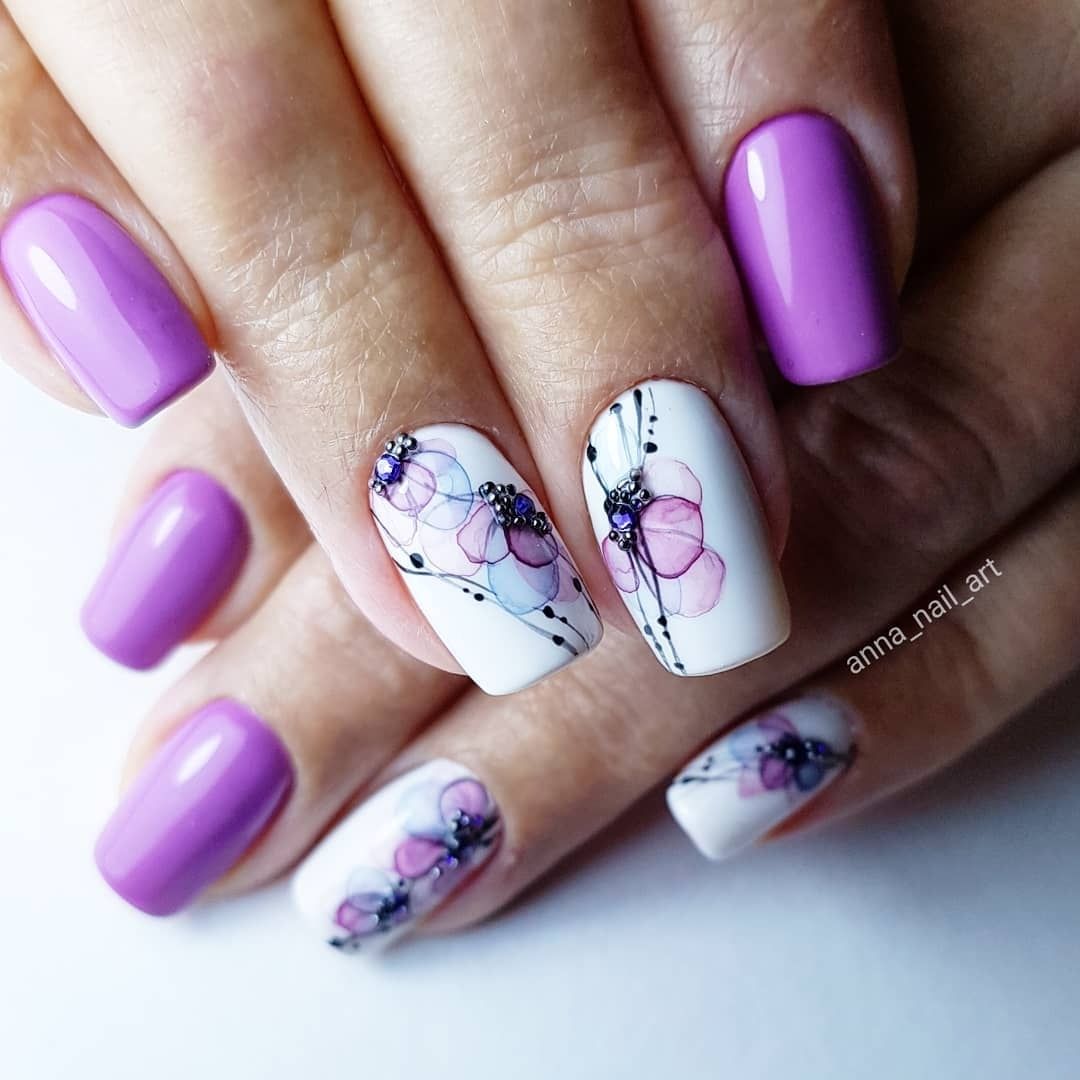 Начните с белого базового лака в качестве основы и на двух ноготках добавьте краски в виде ярких красивых цветов. Сочетание белого лака с фиолетовым выглядит очень красиво и стильно!