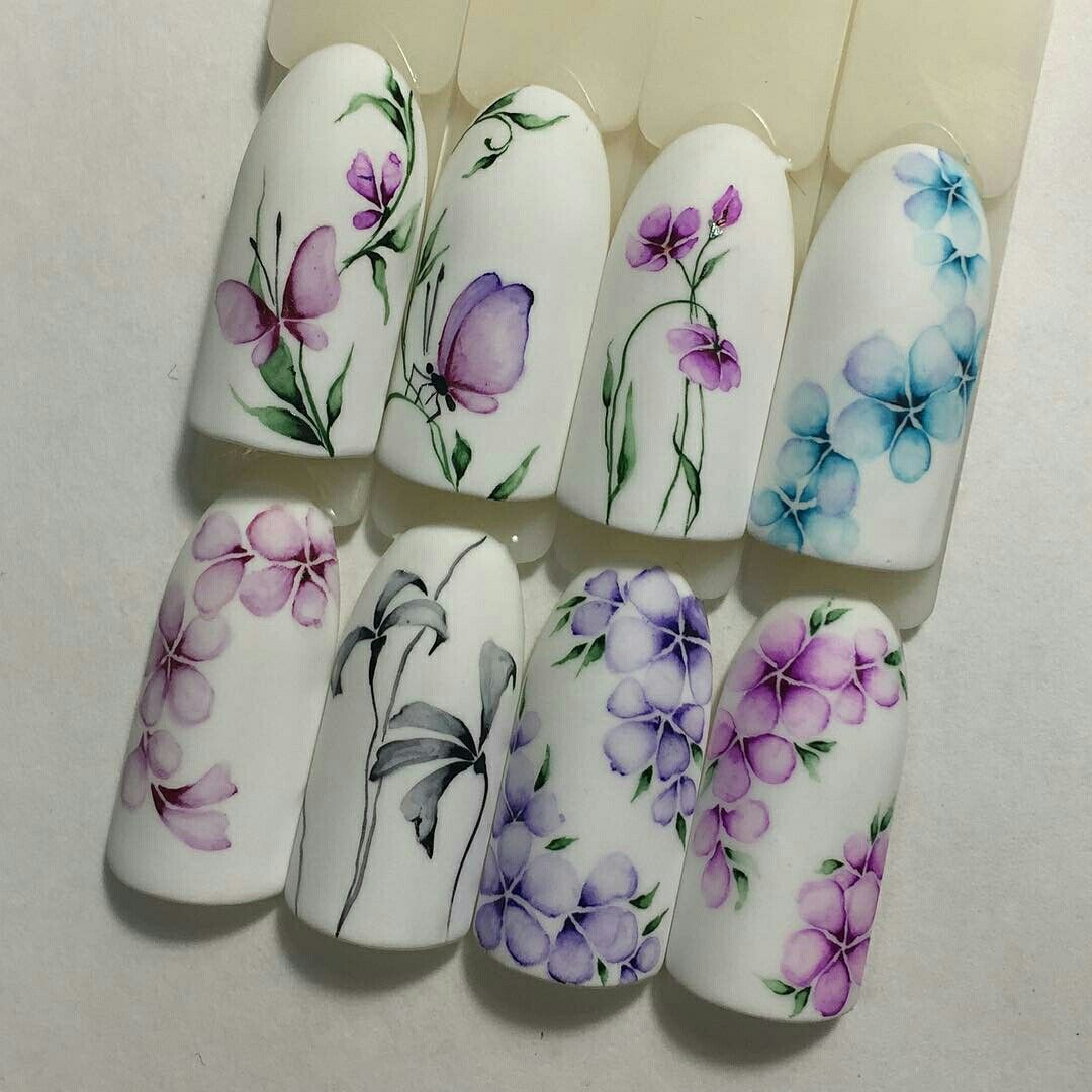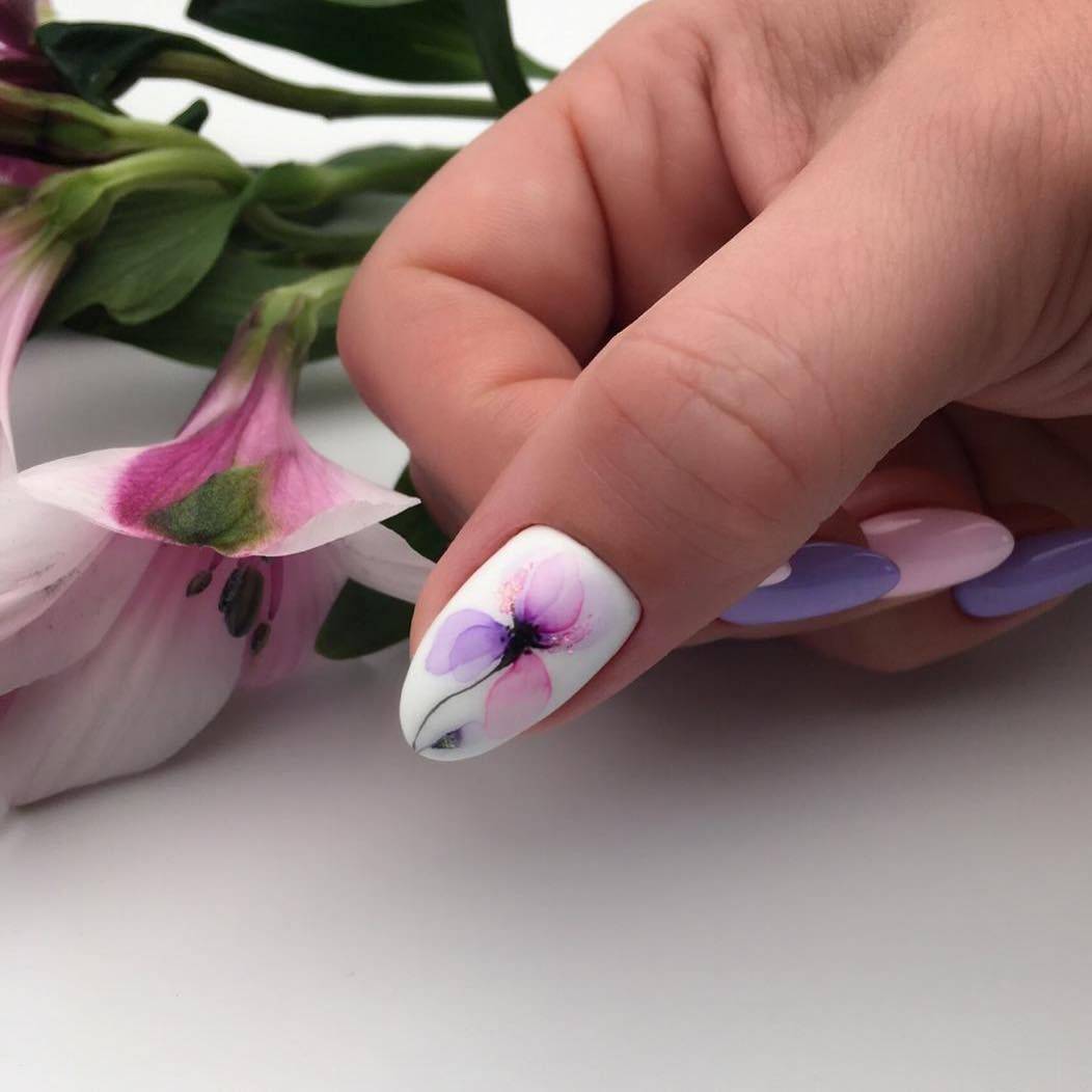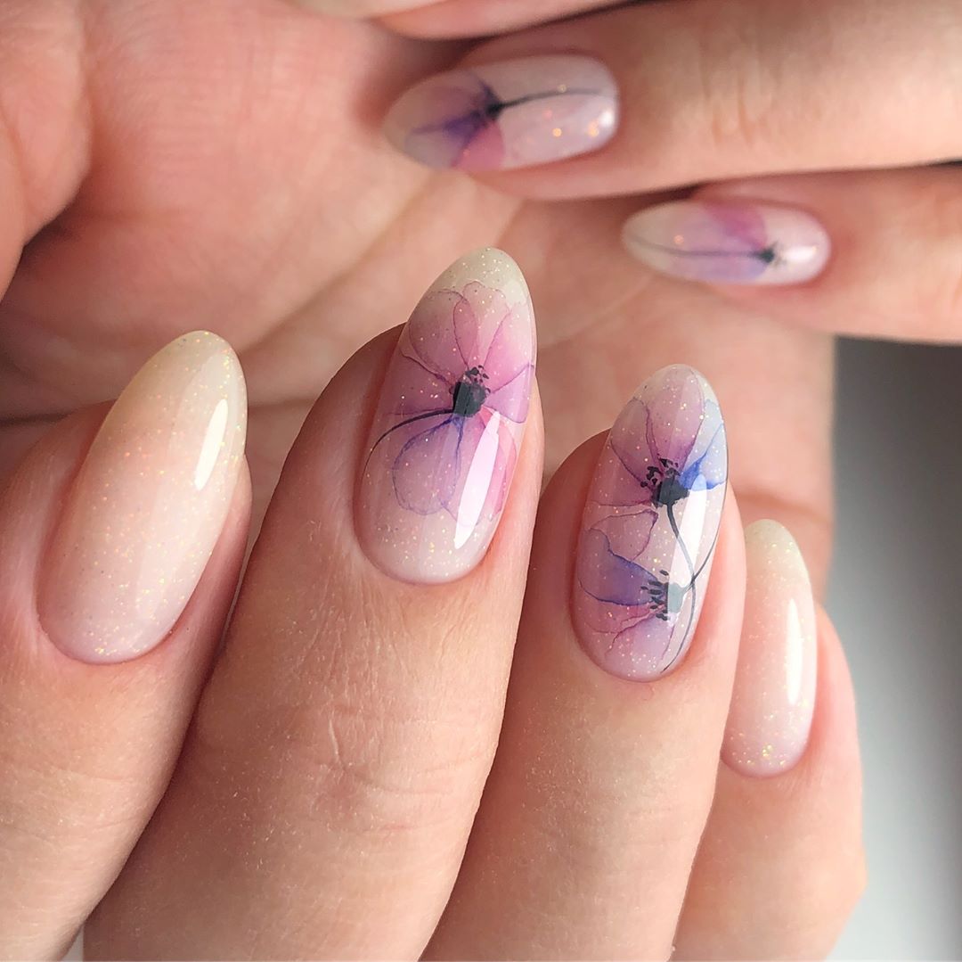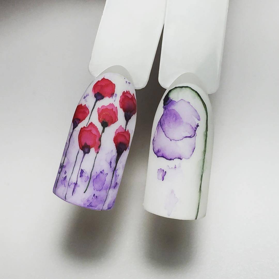 На протяжении многих лет цветочный принт является едва ли не самым популярным видом дизайна ногтей. Он используется в качестве французского декора, однотонного покрытия и многих других вариантов дизайна. Поэтому неудивительно, что цветы все чаще используются в технике акварели. Это позволяет смешивать оттенки в правильных пропорциях для получения нужных тонов. Примечательно, что эта техника не требует нанесения нескольких слоев краски. Самое главное – применять их аккуратно, без перерывов.