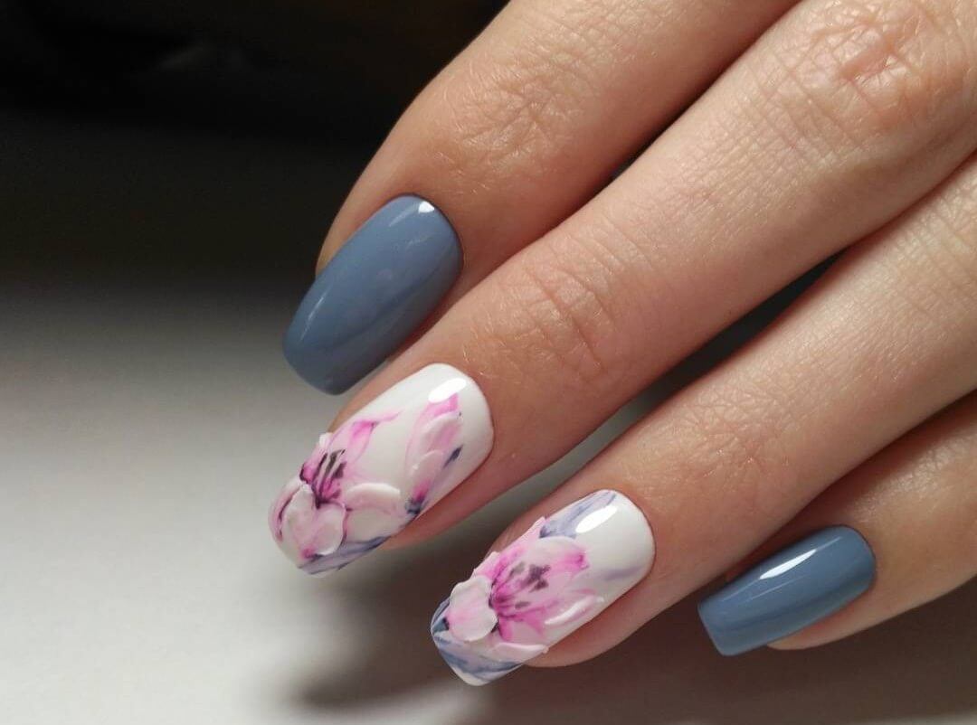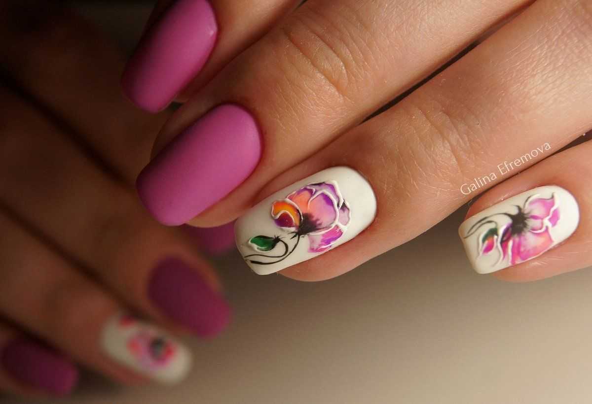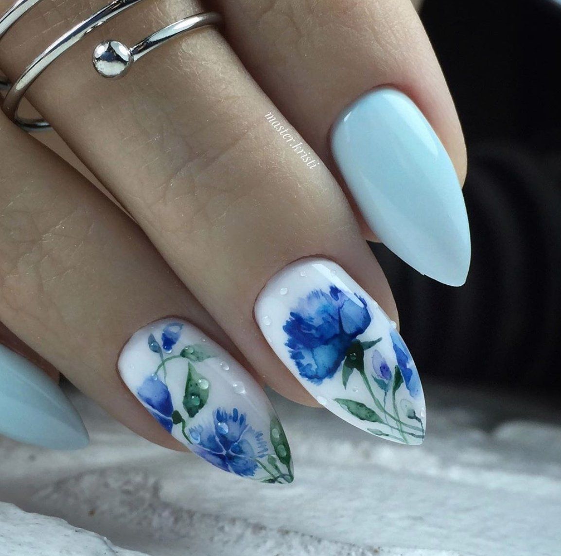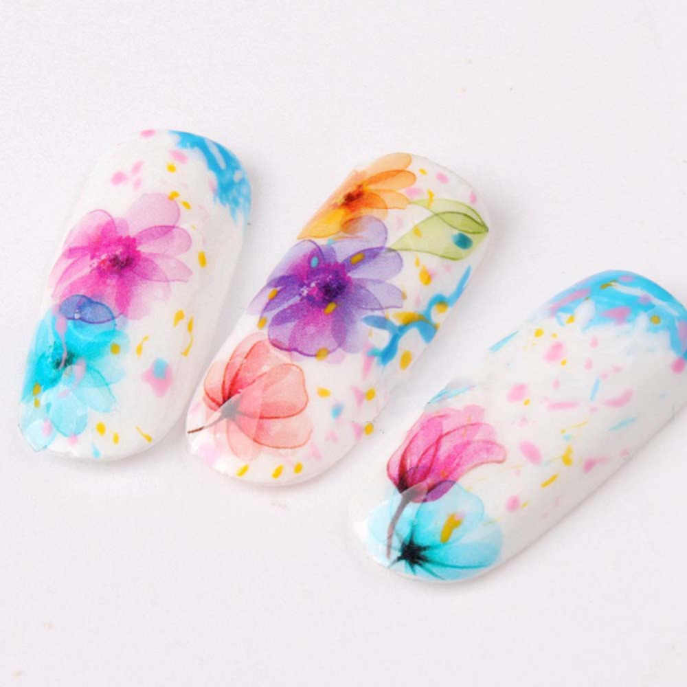 На протяжении многих лет цветочный принт является едва ли не самым популярным видом дизайна ногтей. Он используется в качестве французского декора, однотонного покрытия и многих других вариантов дизайна. Поэтому неудивительно, что цветы все чаще используются в технике акварели. Это позволяет смешивать оттенки в правильных пропорциях для получения нужных тонов. Примечательно, что эта техника не требует нанесения нескольких слоев краски. Самое главное – применять их аккуратно, без перерывов.