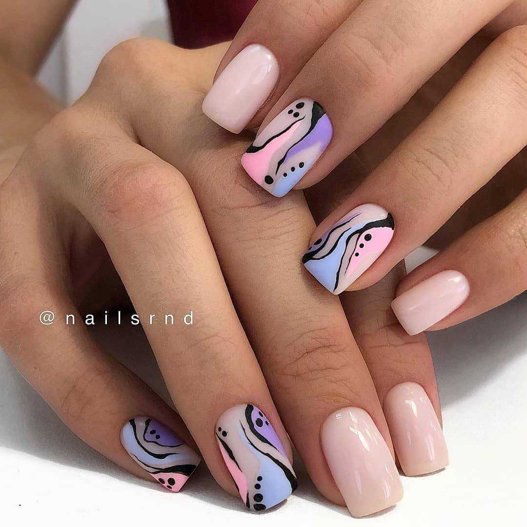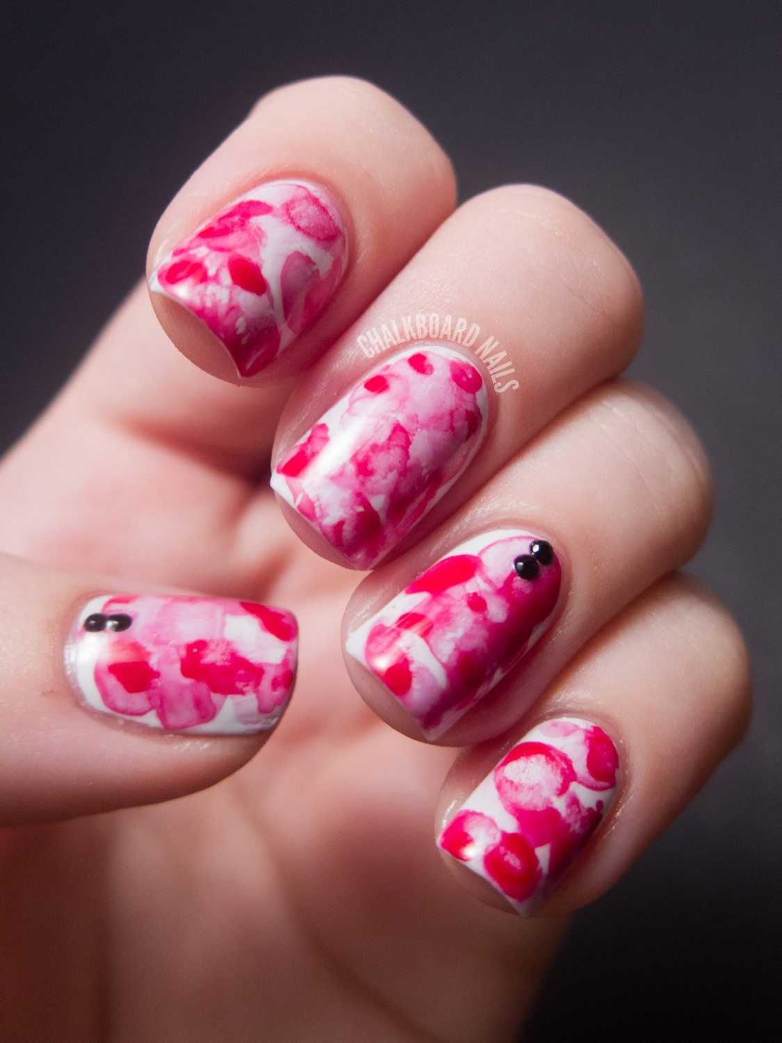Сначала сделайте яркие хаотичные пятнышка на каждом из ноготков, потом нанесите легкие штрихи с помощью черной акварели. Этот нейл-арт выглядит очень красиво и модно, особенно в матовом топе.