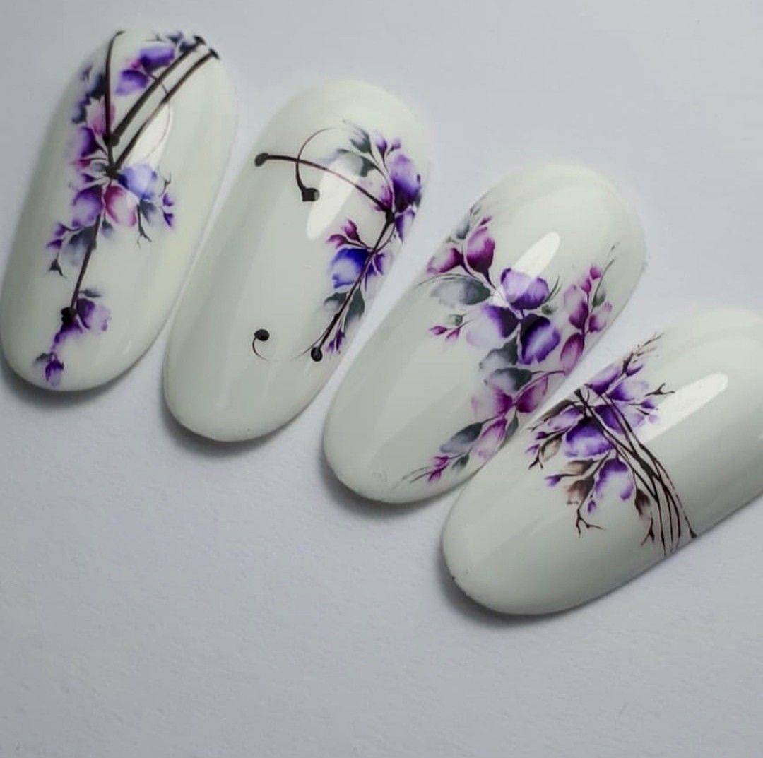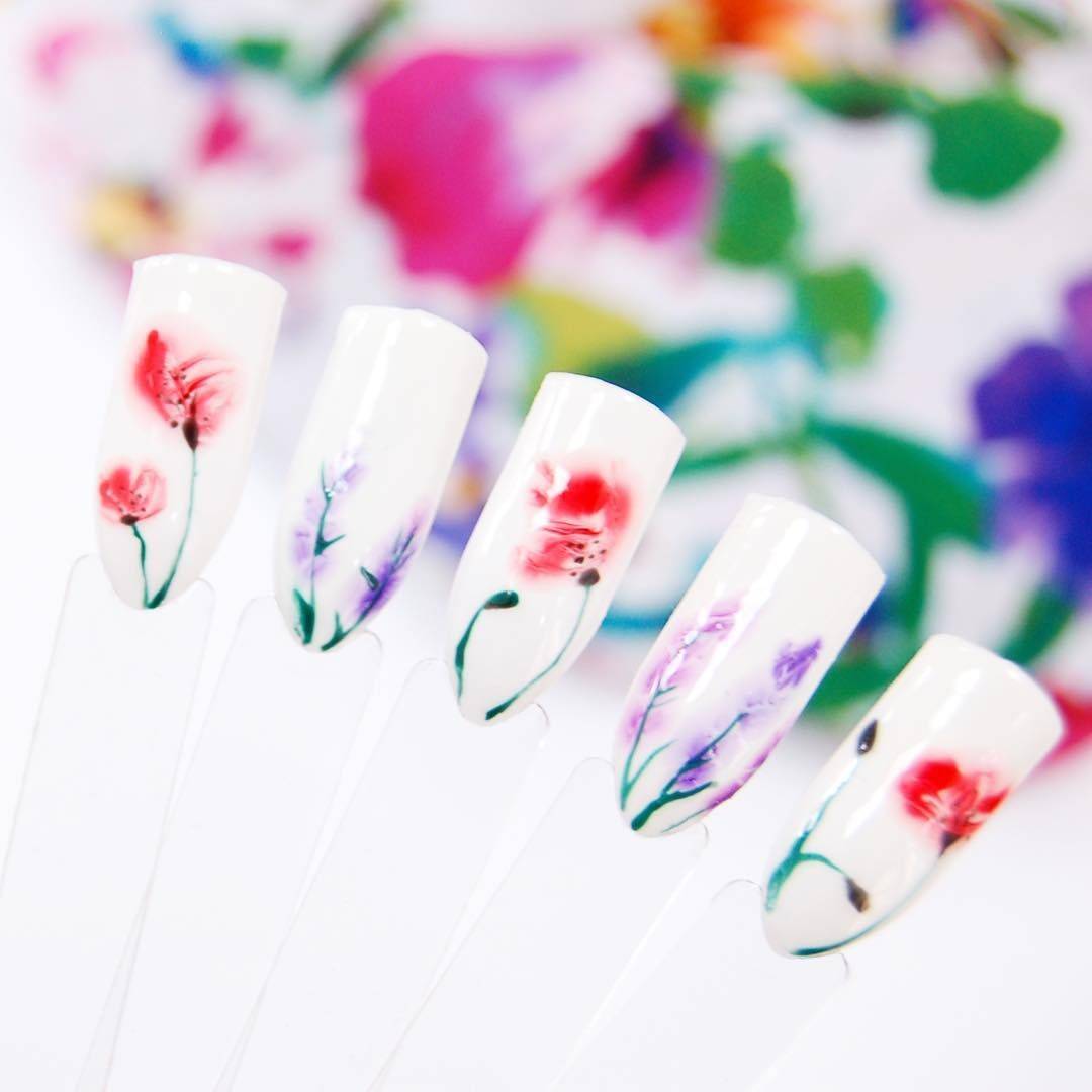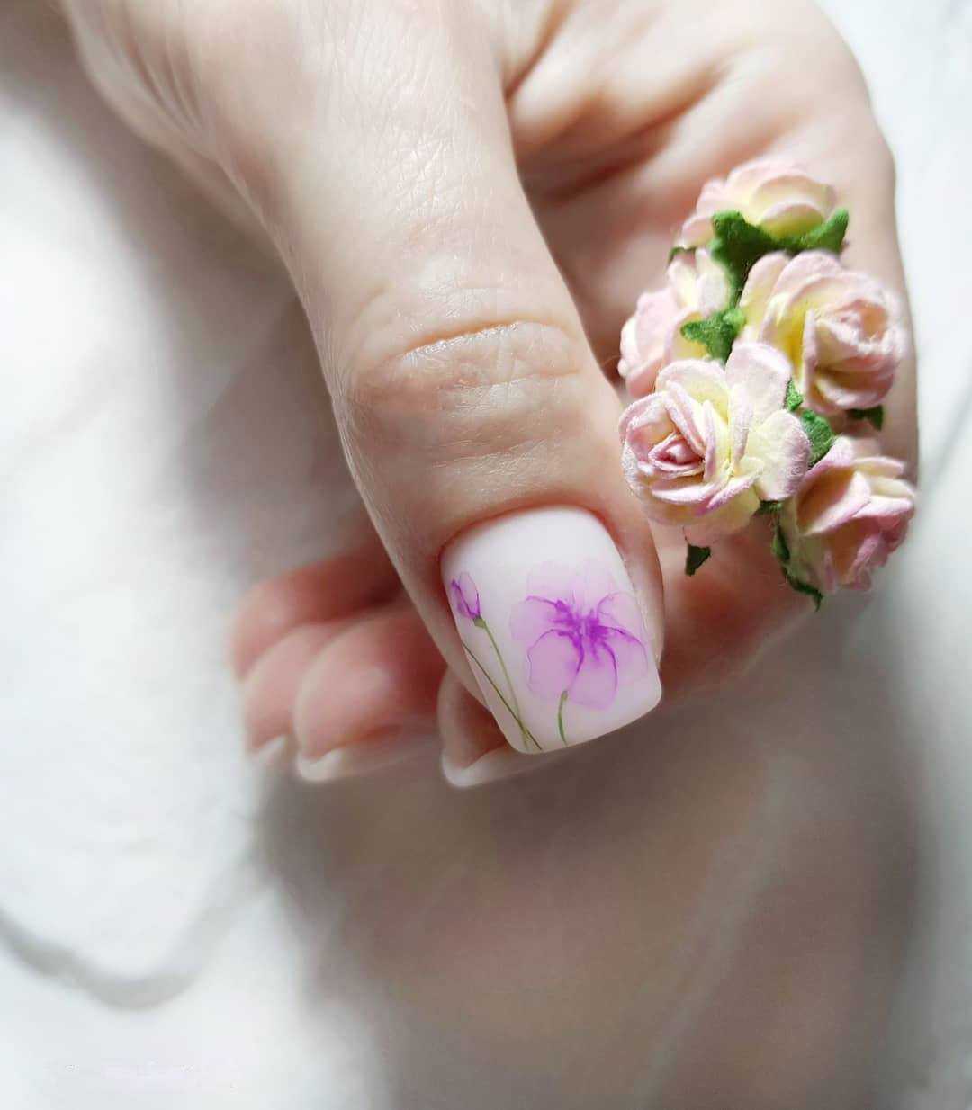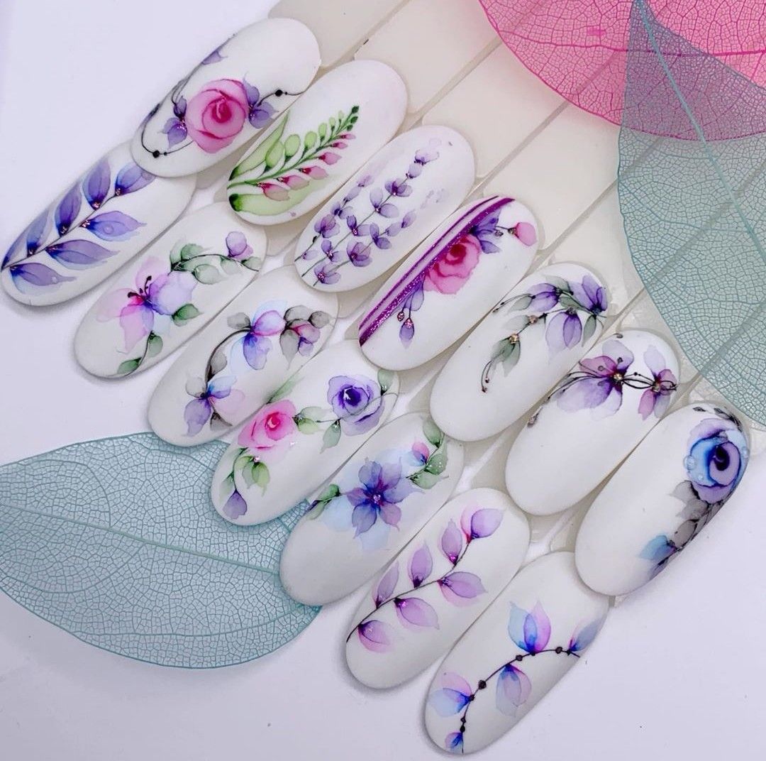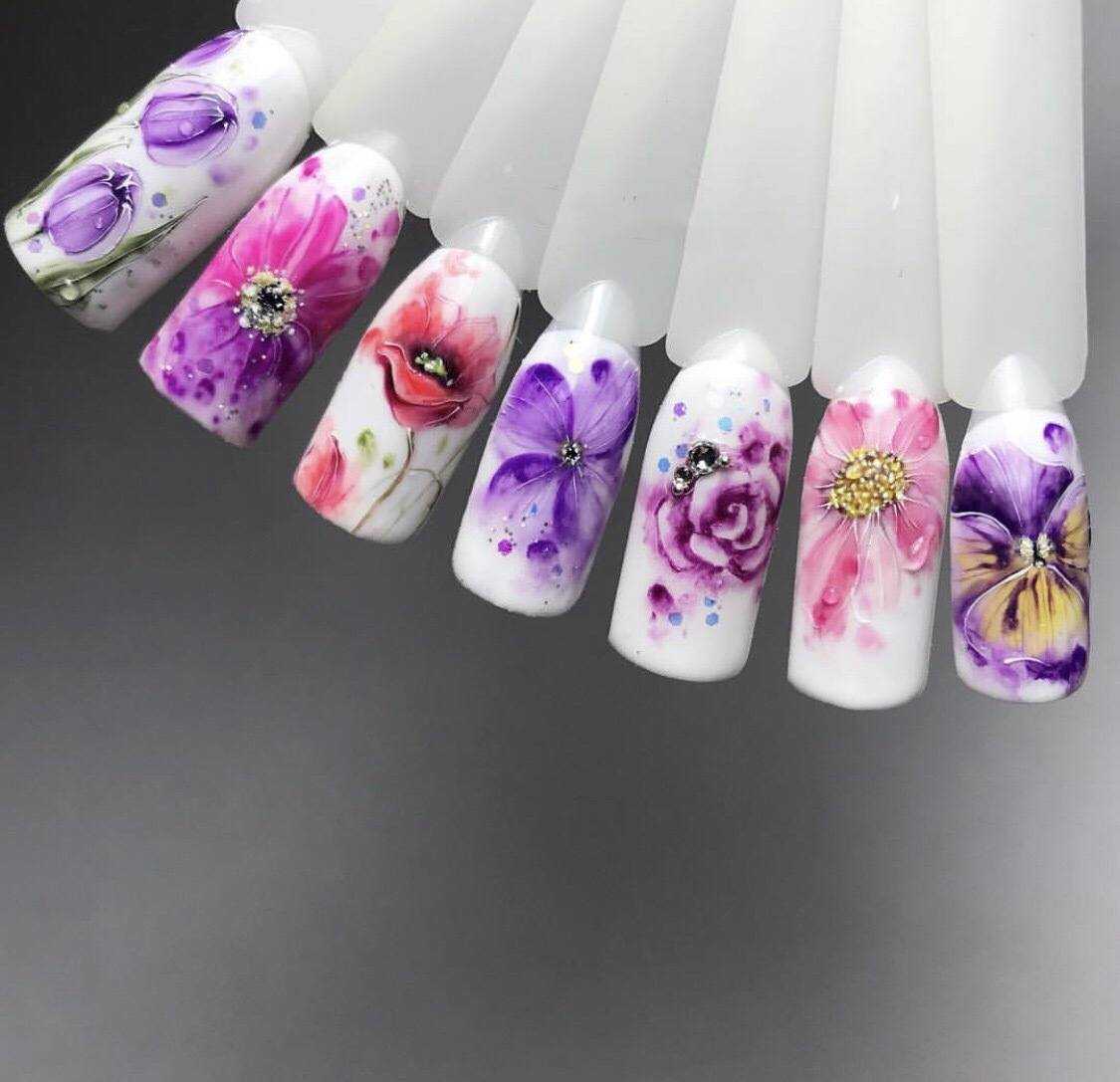 Нарисуйте несколько красивых цветов на ногтях в стиле акварели. Используйте белый лак в качестве фона и размытые цвета для самих цветов и листьев, такие как желтый, сиреневый и зеленый.
