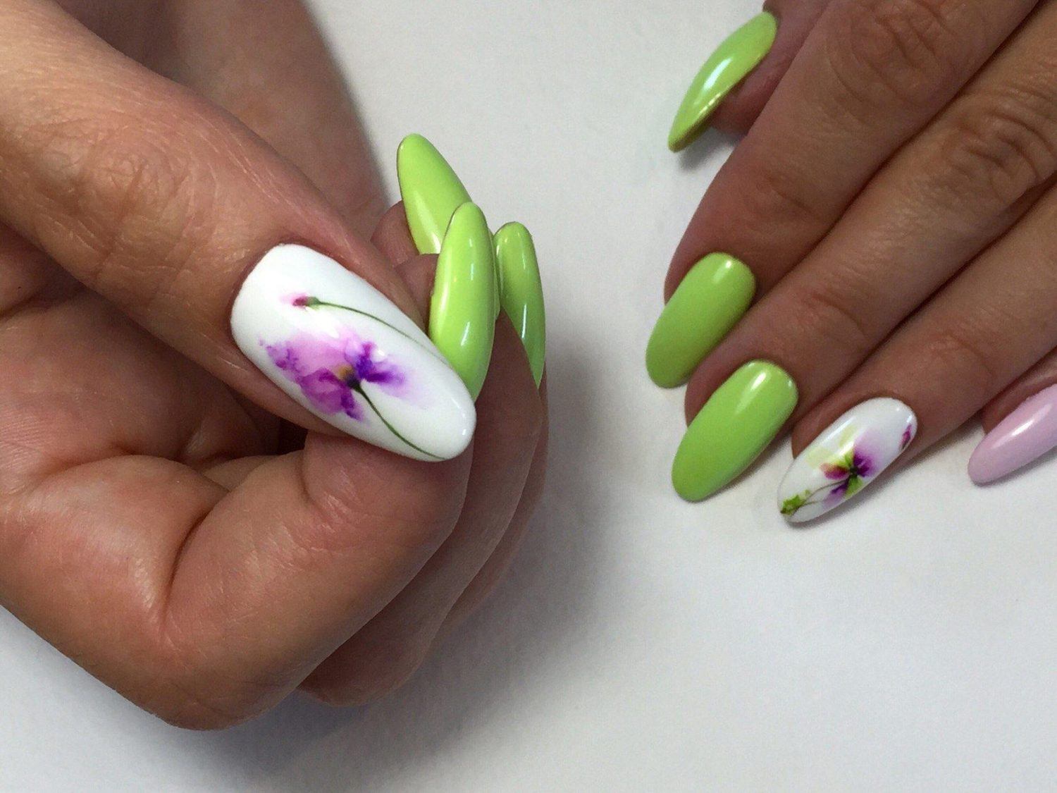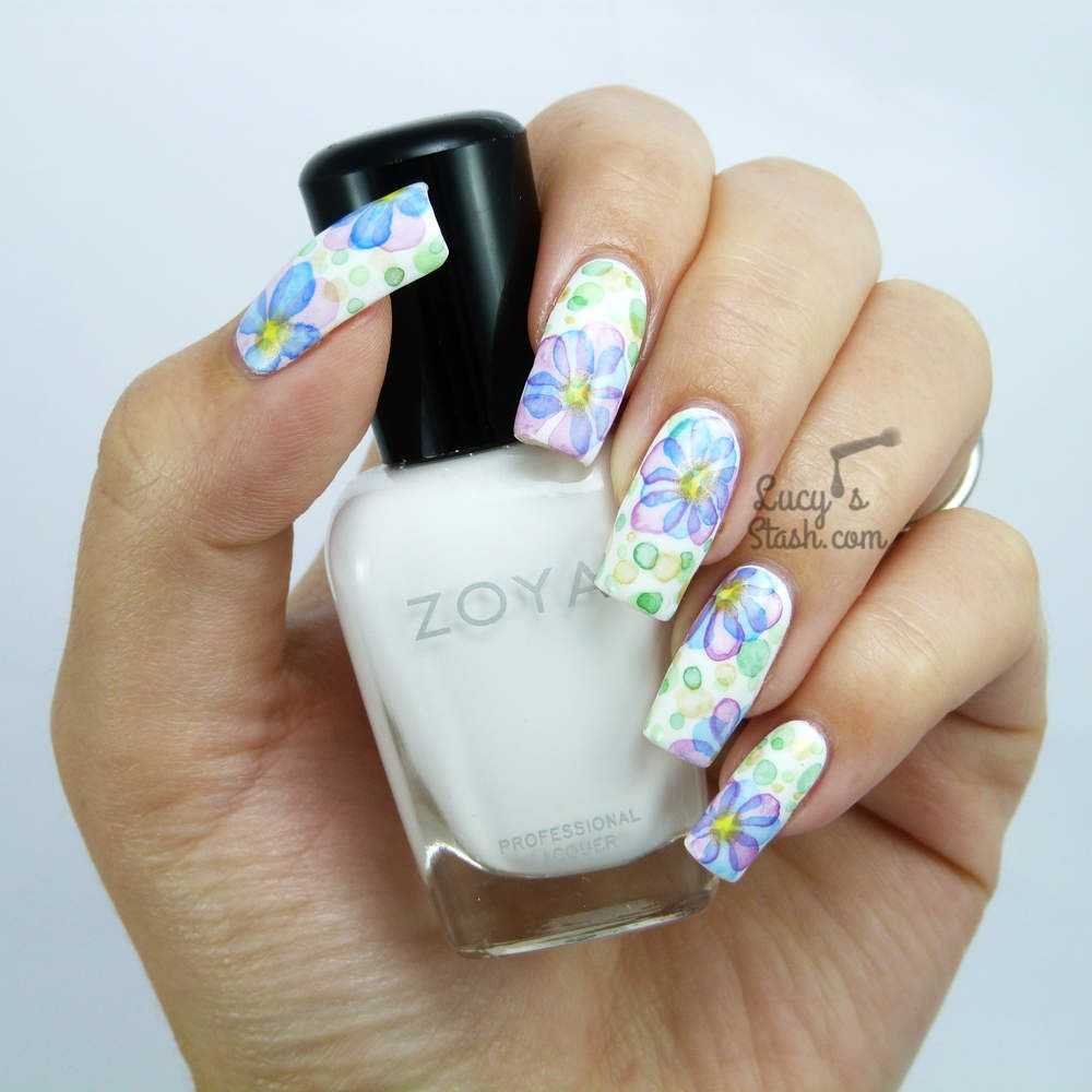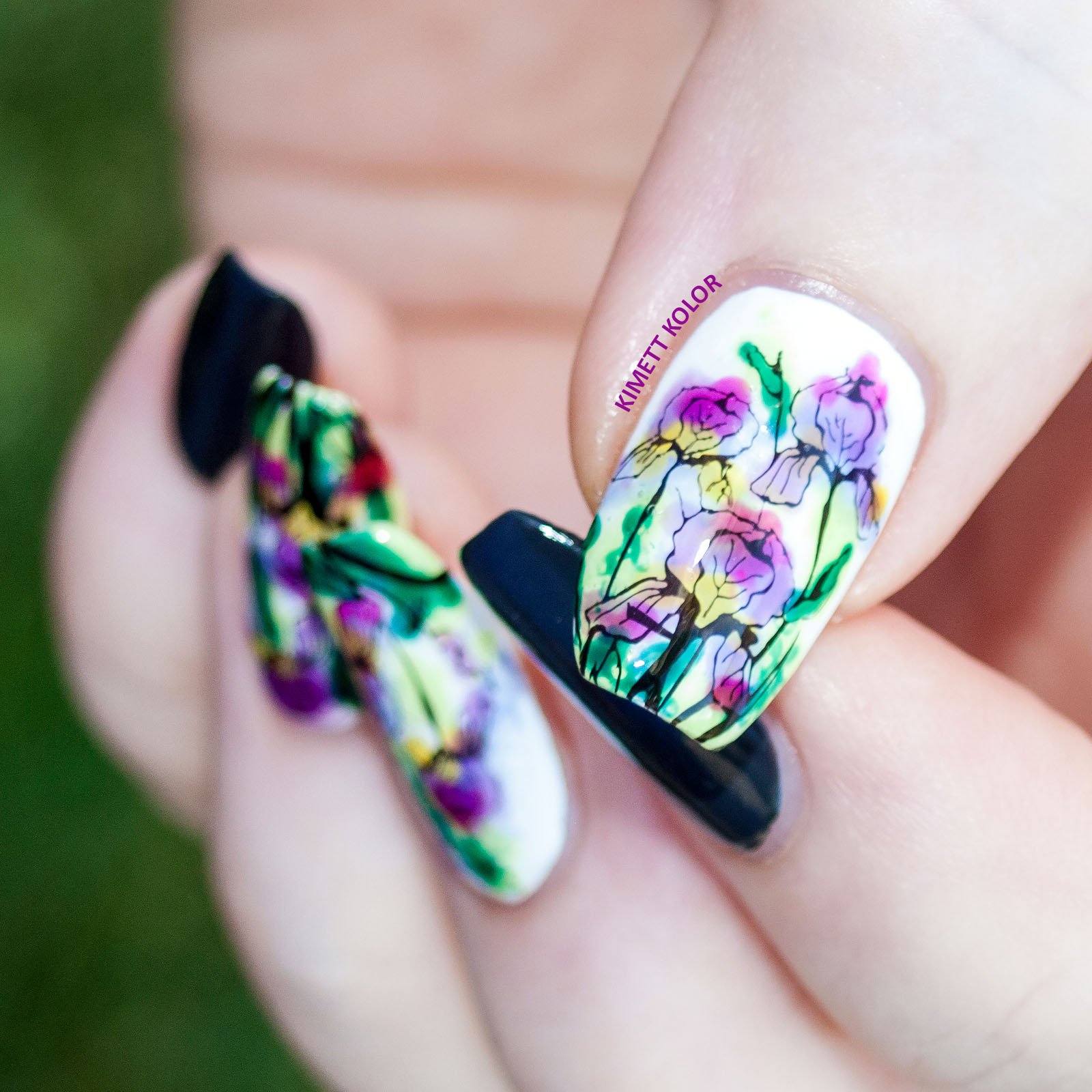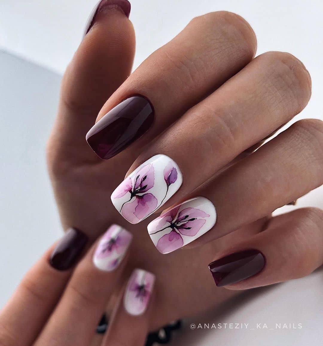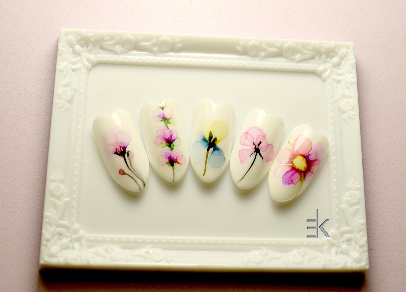 Нарисуйте несколько красивых цветов на ногтях в стиле акварели. Используйте белый лак в качестве фона и размытые цвета для самих цветов и листьев, такие как желтый, сиреневый и зеленый.