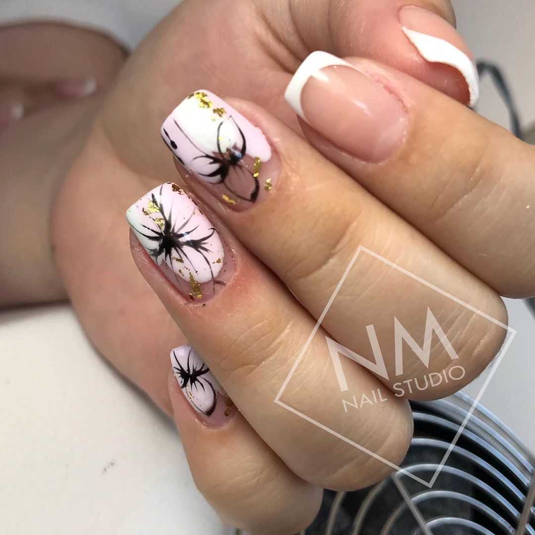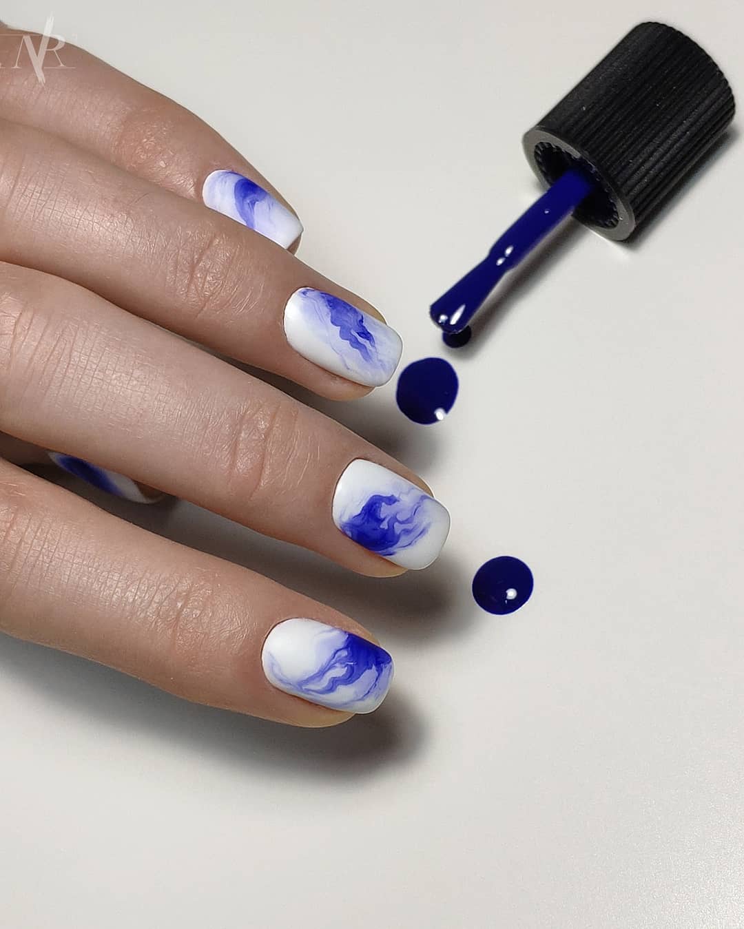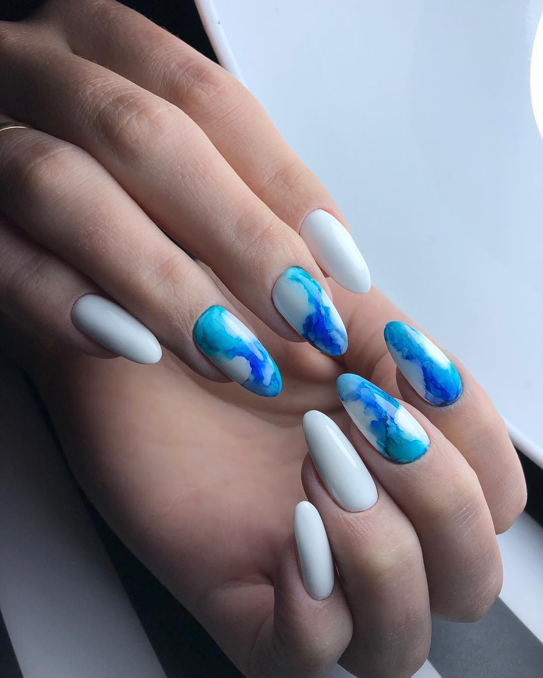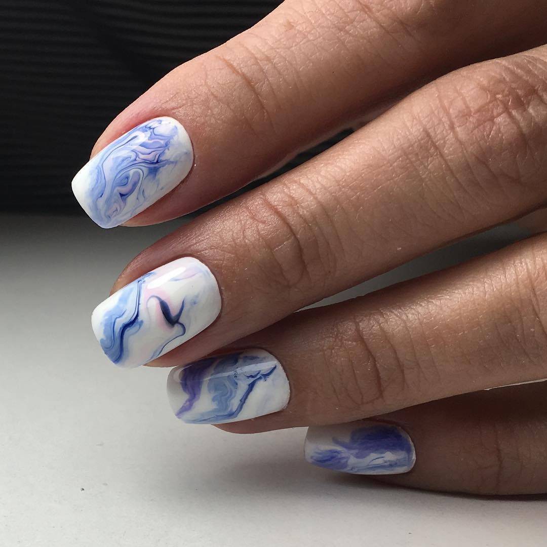 Для создания такого дизайна за основу используется гель-лак белого цвета, а за разводы берутся любые другие оттенки. Один из самых популярных вариантов — черные полосы на белом фоне.