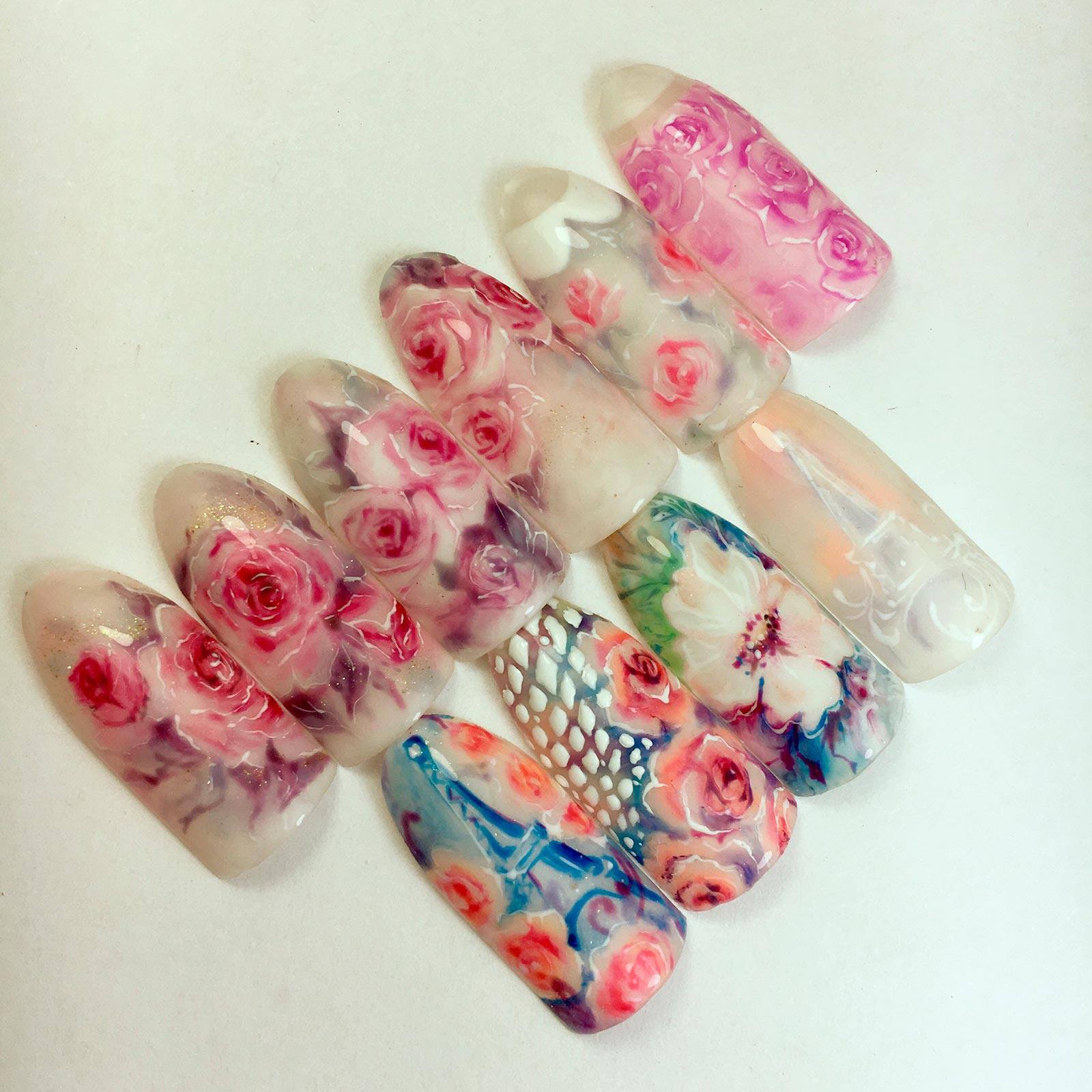 Профессионализм мастера играет ключевую роль в маникюре акварелью, это почти художественная, ювелирная работа, а также чувство стиля и колористики. Для работы в маникюре используются настоящие акварельные краски, которые от обычных отличаются составом, позволяя создавать нежные, нейтральные и очень красивые рисунки. Рисунки могут быть самыми разнообразными, но чаще всего это цветочные мотивы, птицы, бабочки и элементы абстракции.