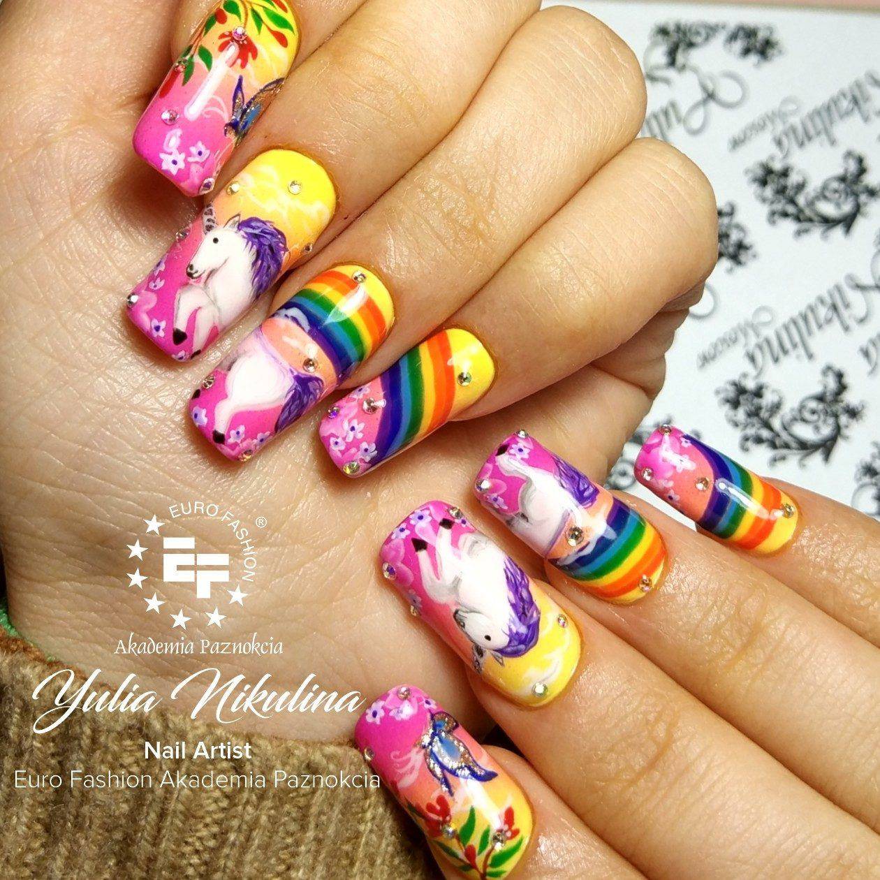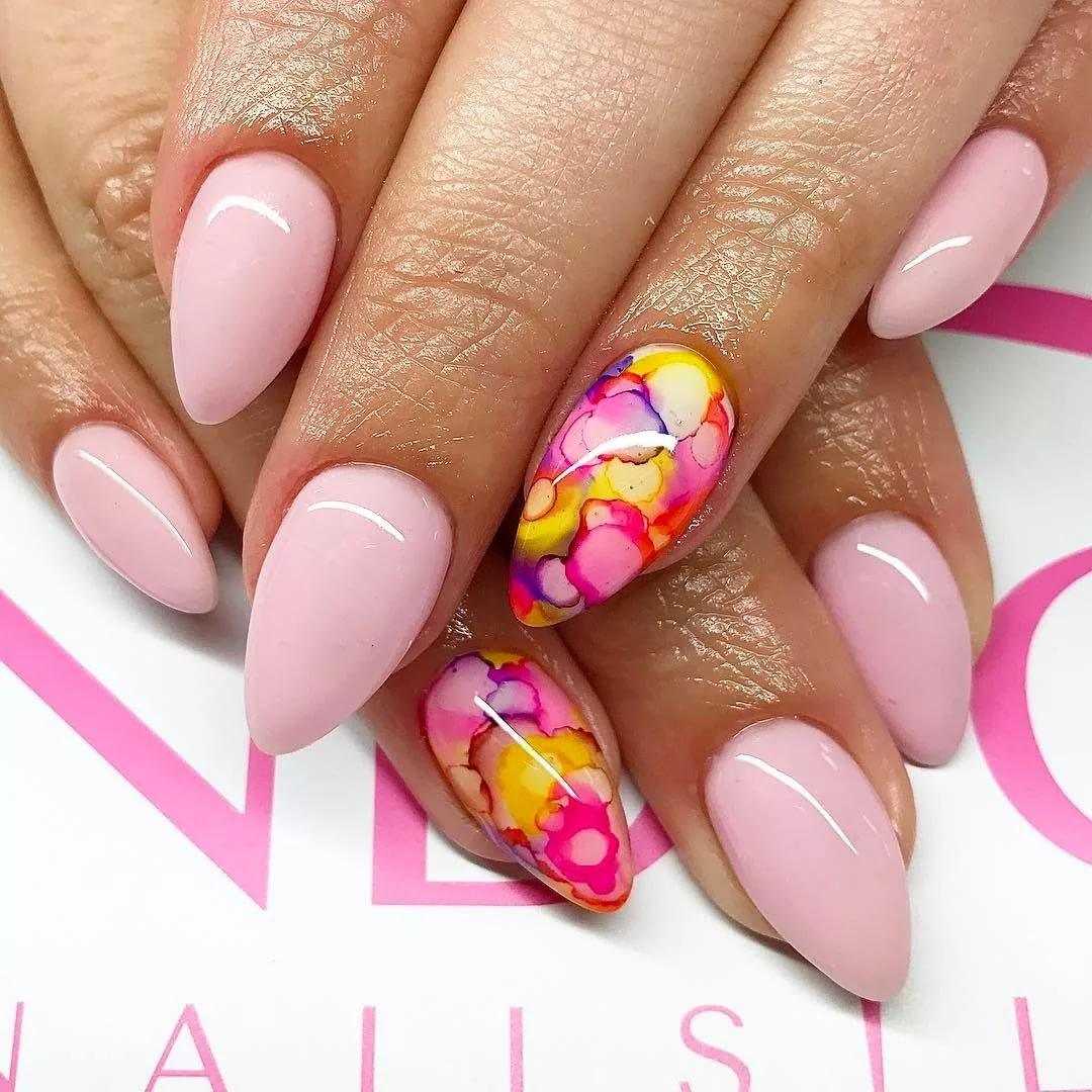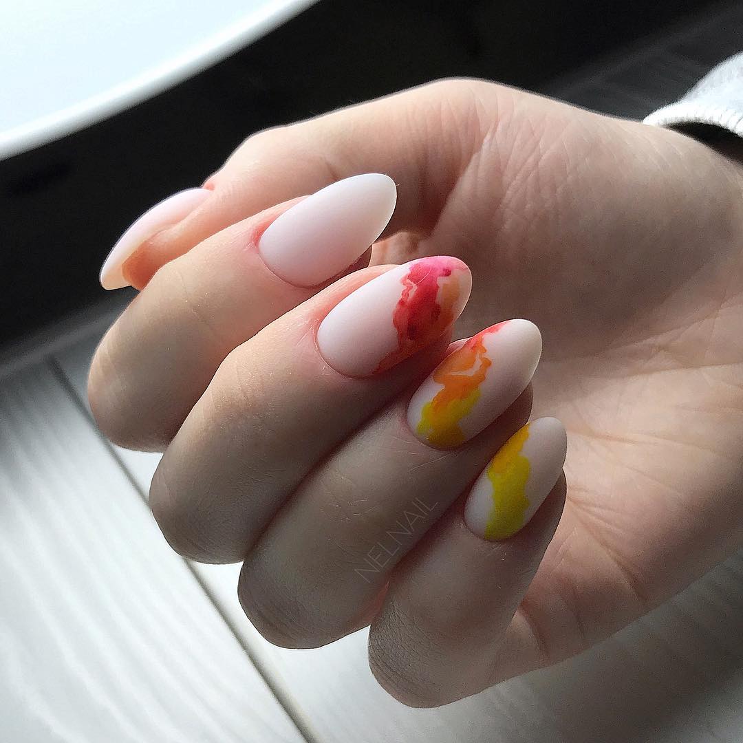 Придайте солнечный свет вашим ногтям с помощью этого красивого акварельного дизайна ногтей на матовой основе. Объедините солнечные цвета, такие как оранжевый, желтый, голубой, красный и зеленый. Рисунок нанесите на нюдовой основе на безымянном пальце и мизинце.