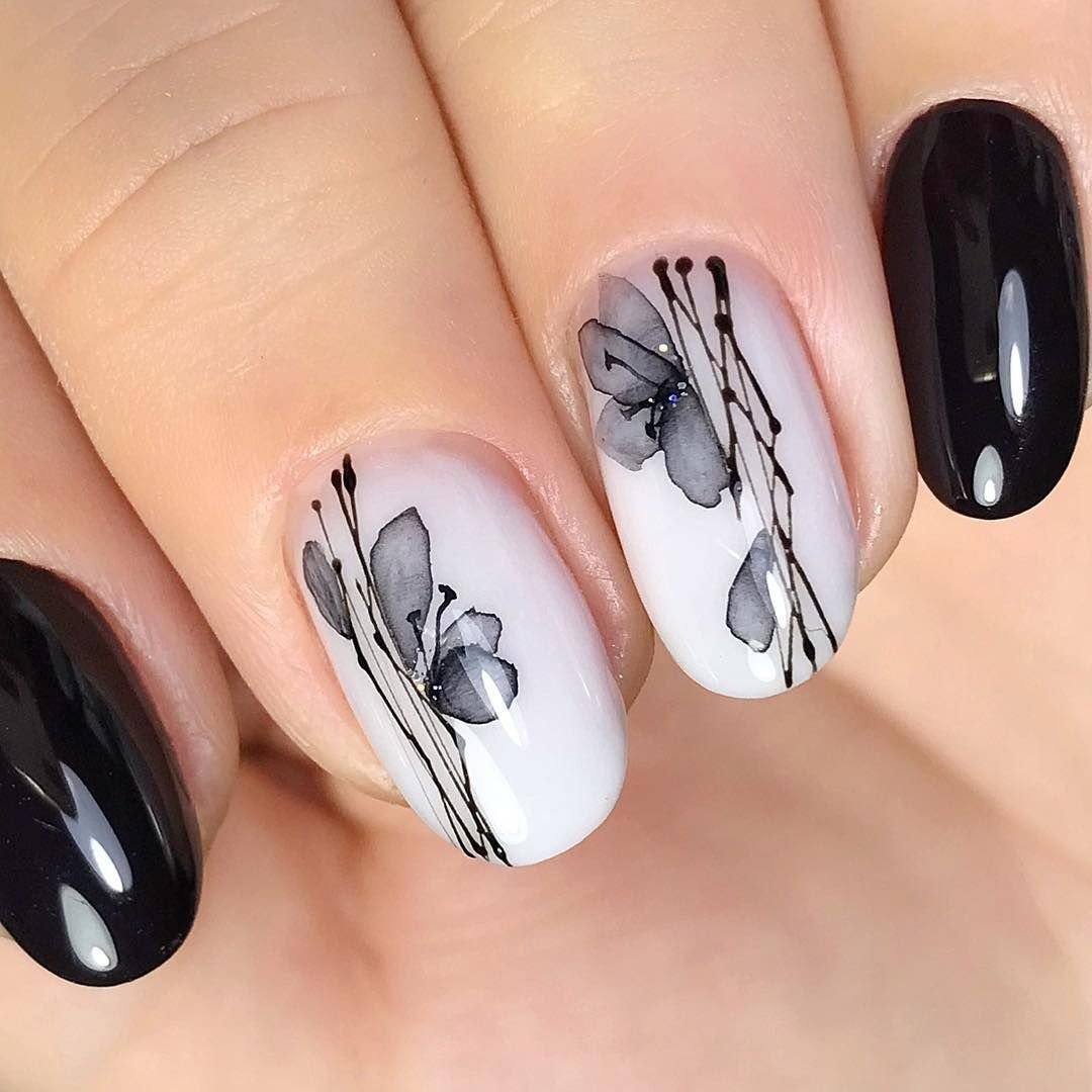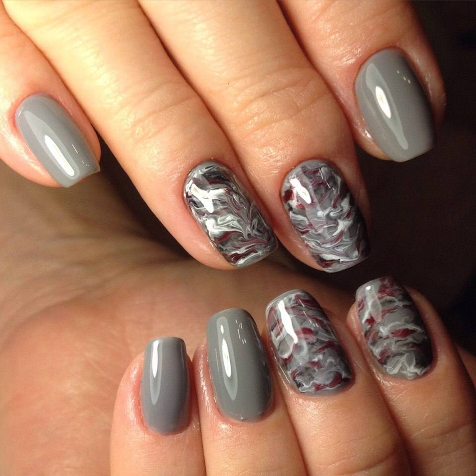 Безукоризненный маникюр на короткие ногти в бело-сером дизайне. Используйте белый лак в качестве основы для нанесения рисунка. Рисунок делайте размытым (дымчатым), можно еще добавить несколько штрихов в виде веточек.