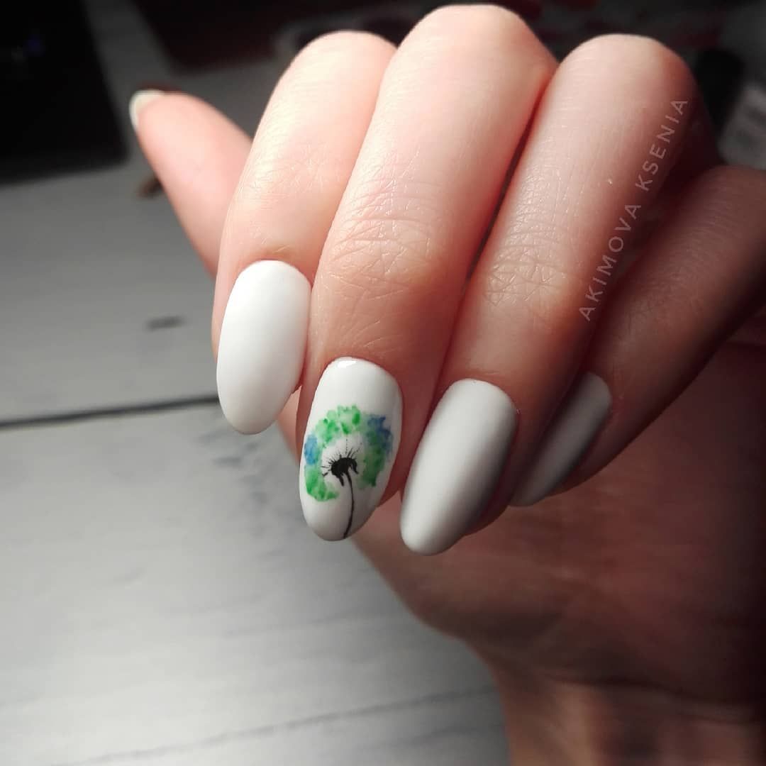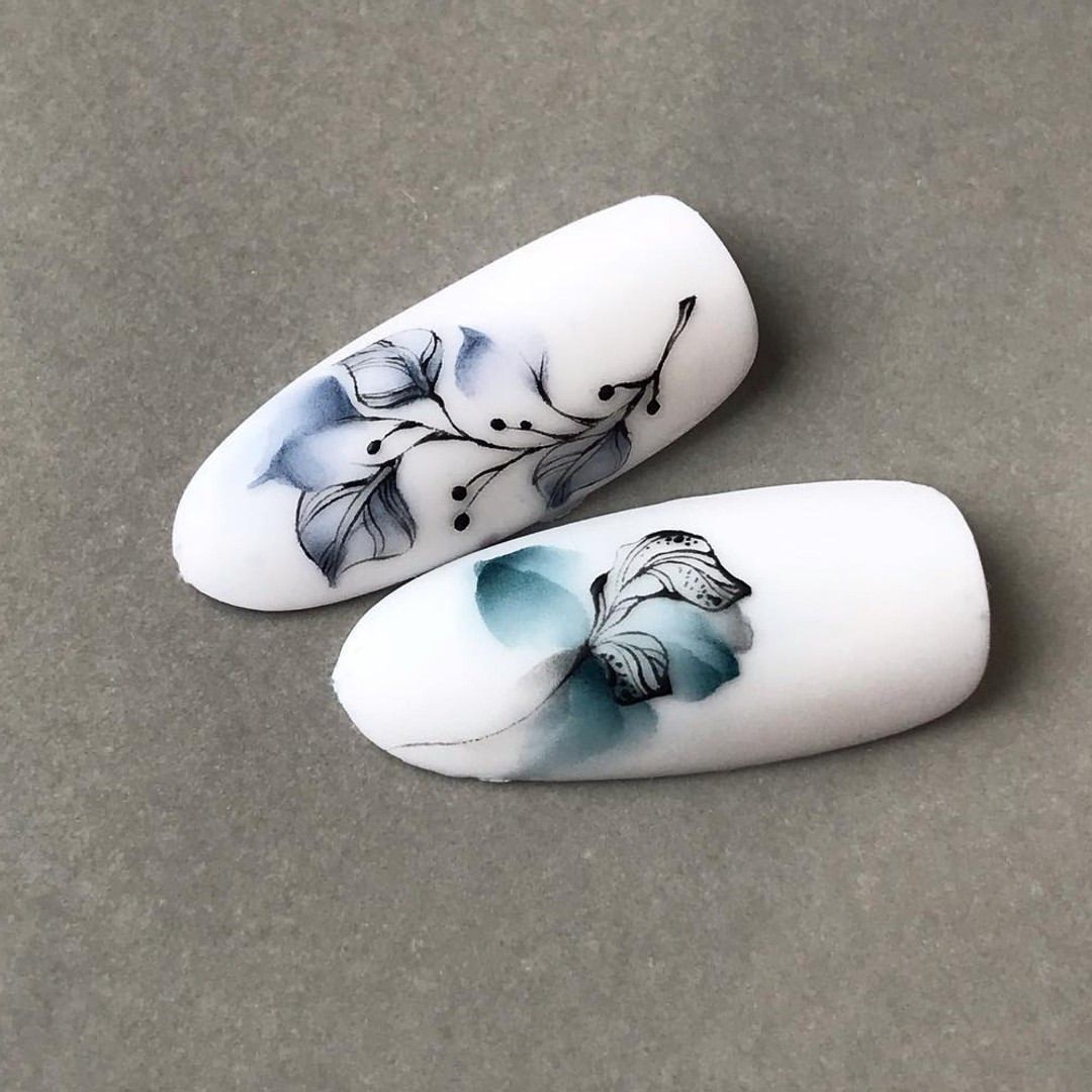 Матовое покрытие и элементы минималистических цветов на каждом ноготке, создают очень красивый и элегантный маникюр в акварельной технике.