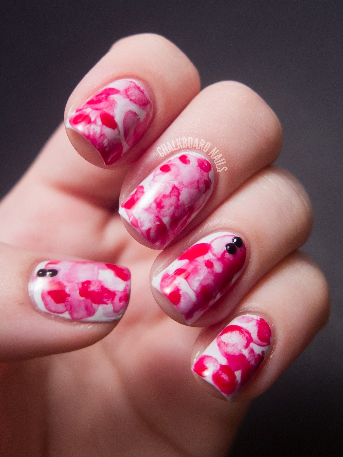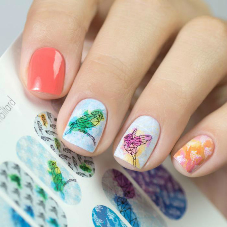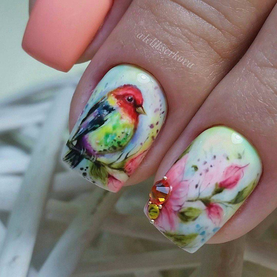Белый лак — один из лучших для маникюра в технике акварель, и эта замечательная яркая птичка шикарно выглядит на белом фоне.