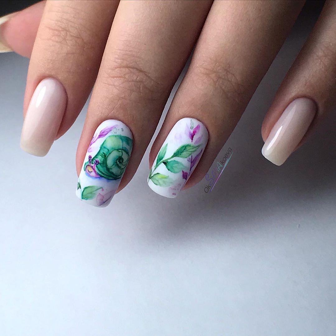 Веточки, разводы тоже очень интересно смотрятся в акварельной технике, можно создать целый шедевр. В этом маникюре очень красивое сочетание цветов и переходов на нюдовой основе.