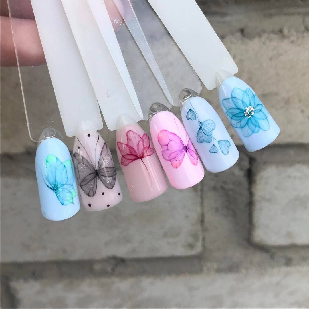 Хорошо детализированный и элегантный голубой цветочный акварельный дизайн ногтей. Нарисуйте красивую бабочку в стиле акварели, используя в качестве основного цвета белый, а также оттенки других цветов. Вы также можете добавить еще веточку в качестве дополнения дизайна.