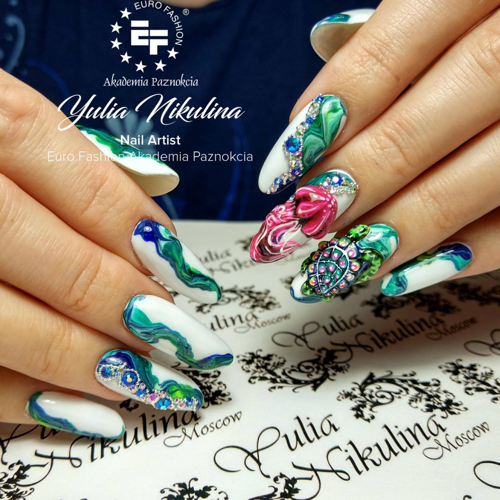 Технически процесс нанесения аквариумного маникюра на наращенные ногти не сильно отличается от действий, описанных выше. Различия есть только в подготовительном этапе, для этого варианта ногтей он сложнее и дольше, ведь для начала форму надо смоделировать и только после можно переходить к творчеству.