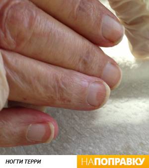 Как правило, ногти Терри белые с красноватыми или темными кончиками, что может указывать на множество заболеваний, включая следующие: