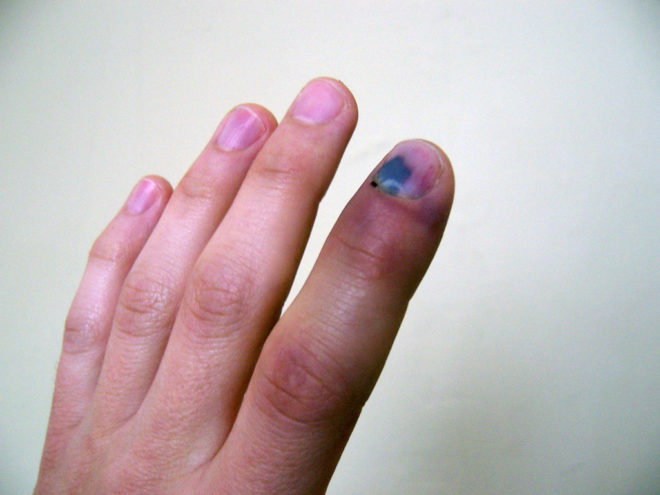 Синим, а порой даже черным цвет ногтевой пластины может стать после ушиба, защемления пальца. В такой ситуации нужно набраться терпения, быть готовым к тому, что ноготь может отпасть. В лучшем случае нужно будет дождаться, когда он отрастет полностью. Сильные ушибы сопровождаются болью, поскольку кровь скапливается под травмированным ногтевым ложе. Палец может пульсировать, распухать, неметь. В таком случае следует обратиться к хирургу для выпускания крови. А до этого прикладывать к зоне травмы холод.