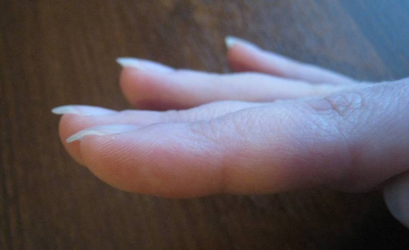 ). Бывает и таковое, что при надавливании на его поверхность, он уголками начинает врезаться в кожу пальца и происходит отслоение ногтя.
