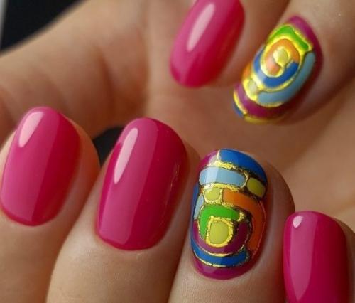 - Когда откололся большой участок гель-лака, и исправить нужно быстро, не посещая мастера, то необходимо подобрать похожий цвет. При отсутствии нужного тона можно применить любой декор: стразы, камешки, бусинки, наклейки и т. д. Используя декоративные элементы, вы сможете визуально убрать дефект покрытия. Сверху весь дизайн стоит покрыть закрепителем.