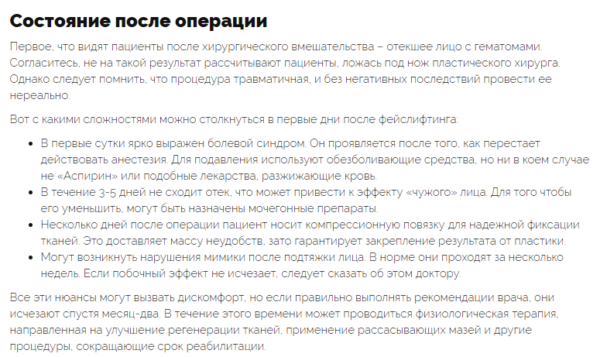 В качестве минусов выступают возможные осложнения после операции, некоторые из них неизбежны – синяки и отек в месте надрезов, появление пигментации, вы можете лишь ускорить процесс регенерации различными мазями и компрессами.
