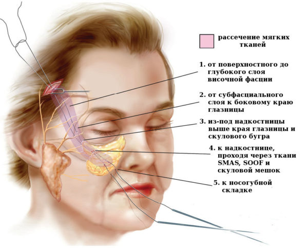 Что касается вопроса анестезии, то для этого применяется исключительно общий наркоз. Выбрать конкретный вид можно только врач-анестезиолог. После того, как пациент уснул, производится подготовка лица к разрезу. Хирург делает разрезы строго по линии роста волос. Специалист всегда делает несколько разрезов. Дальнейший ход операции зависит от ее вида.