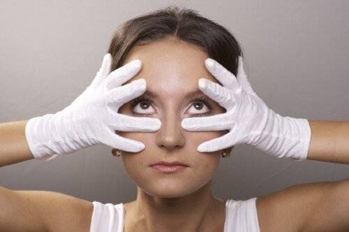 - Для проработки верхних век расположите пальцы под бровями и с силой сдвиньте брови вверх. Упражнение также борется с морщинами на лбу.