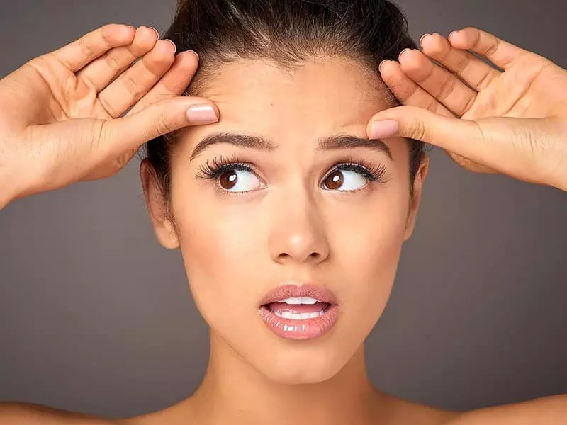 - Положите на область лба пальцы обеих рук так, чтобы одни из них находились на уровне бровей. Поднимайте глаза и брови кверху, препятствуя движению с помощью пальцев.