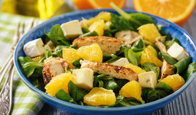 Отварить 250 грамм куриной грудинки, остудить и нарезать небольшими кубиками. Вымыть, высушить шпинат и разложить на блюде. Выложить на листки нарезанную куриную грудинку с кусочками апельсина, полить оливковым маслом, смешанным с лимонным соком. В дополнение к салату можно добавить немножко кишмиша и семечек, кусочков орешков.