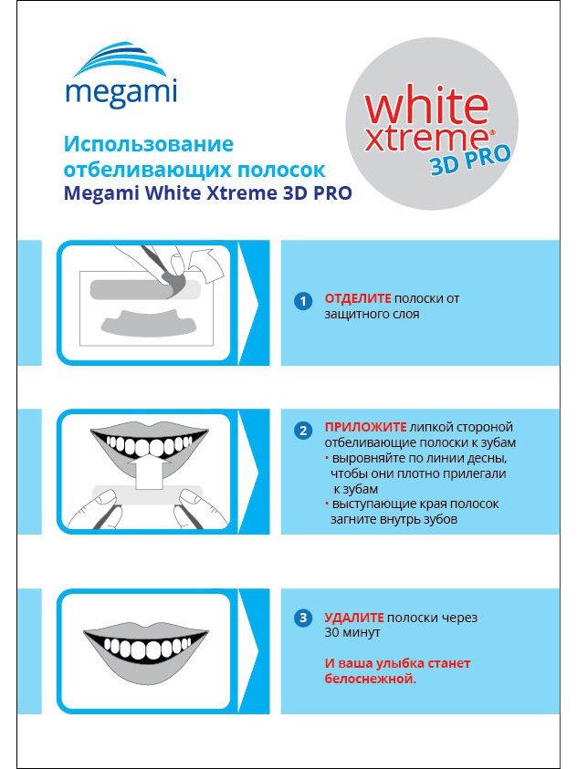 В упаковке Megami White Xtreme 3D есть 14 пар, каждая из которых находится в индивидуальном герметичном пакете. Полоски точно повторяют форму зубов, плотно прилегают и просто снимаются. Использовать их нужно в течение недели 2 раза в день.
