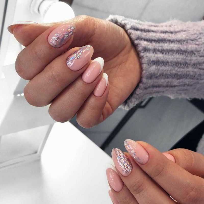 Легкое мерцание оживит однотонное покрытие на ногтях. Для нежного маникюра лучше использовать совсем мелкие блестки. Ими можно сделать растяжку от свободного края ногтя к кутикуле, выделить свободный край или лунки.