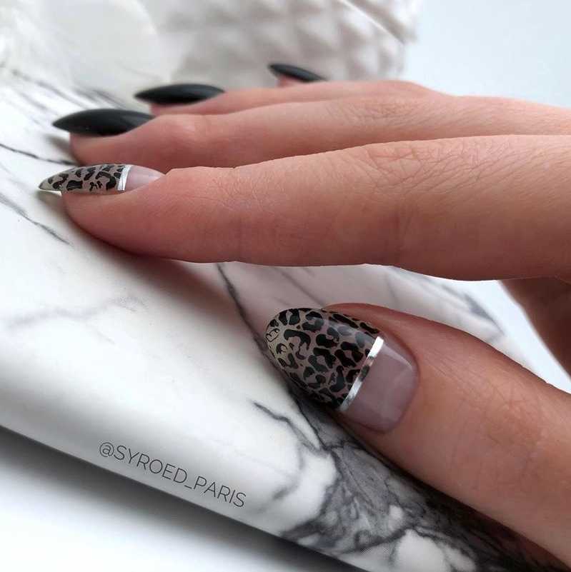 Французский маникюр можно разбавлять леопардовыми узорами, сглаживать линию перехода камнями или блестками. Цвета при этом могут быть не классические, а сочетаться самым непредсказуемым образом: черный и белый, голубой и синий.