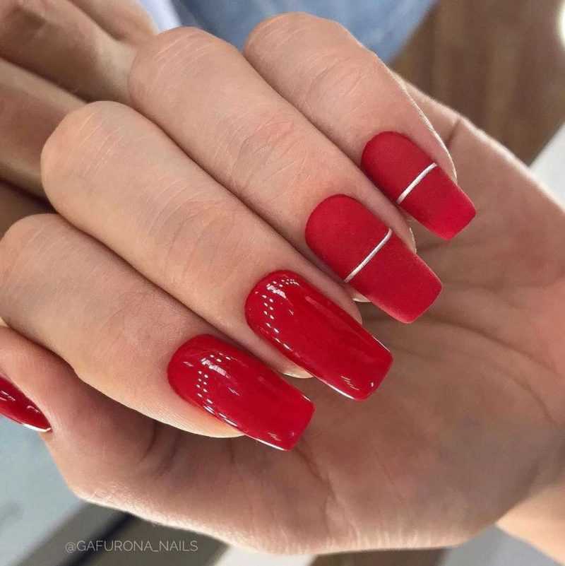 Однотонное покрытие гель-лаком с матовым финишем выглядит благородно и оригинально. Этот вариант одинаково хорош как для светлого, так и для темного покрытия. Разнообразить маникюр помогут стразы, блестки, камифубуки, комбинации с глянцевым покрытием.