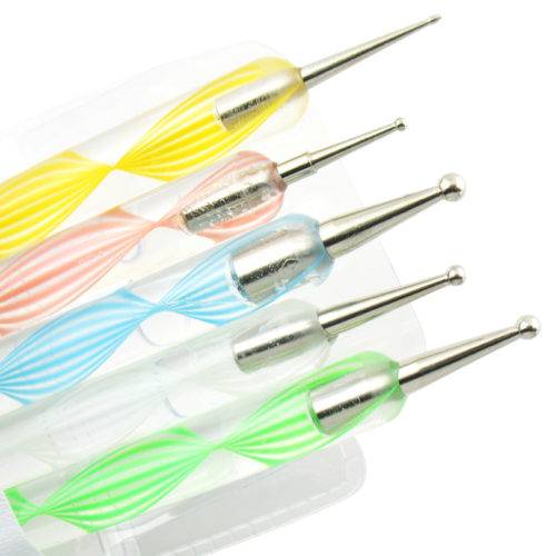 На вид дотс напоминает палочку, на конце которой расположен металлический стержень с закругленным наконечником. Он может иметь разный диаметр, в зависимости от которого на поверхности ноготка получаются разные по размеру точки. Сегодня встречаются преимущественно двойные дотсы, в которых есть сразу два разных по размеру наконечника. Что до материалов, данный инструмент изготавливается из пластмассы, металла или дерева.