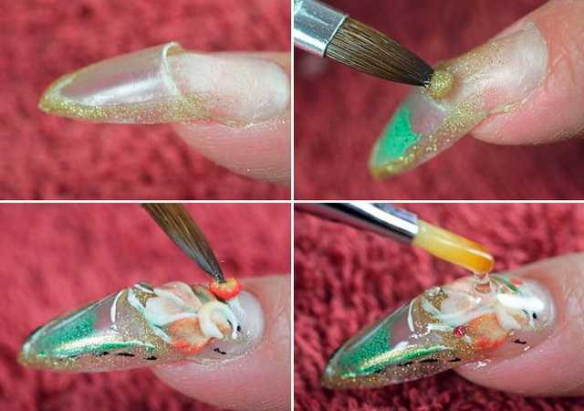 В аквариумном дизайне ногтей используют цветные акрилы, блестки, стразы, фольгу, сухоцветы, моделирующие и защитные материалы.