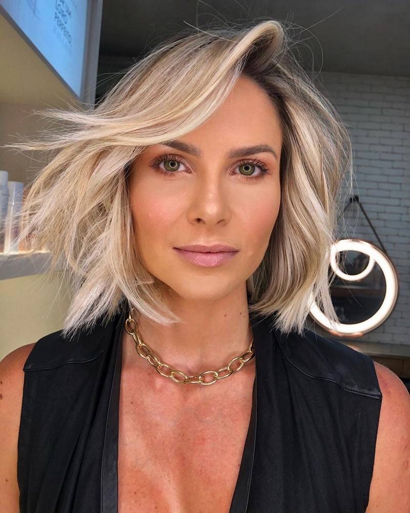 Стрижка со слегка растрепанными волосами до подбородка поможет акцентировать внимание на скулах