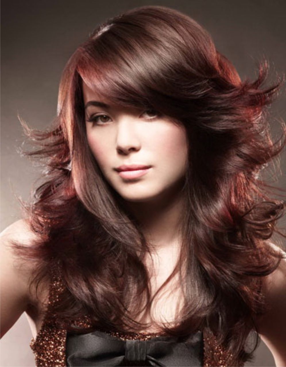 В число самых популярных причесок входит многослойный каскад, имеющий ступенчатую основу. Коррекция овала осуществляется за счет удлиненных прядей по бокам и в затылочной области, а также за счет густо филированной макушки.
