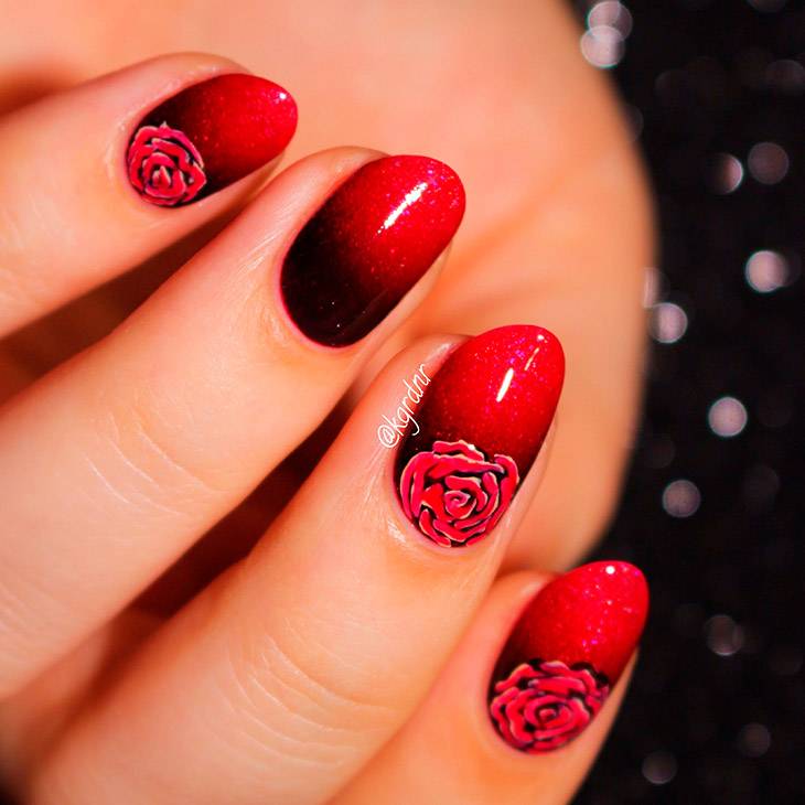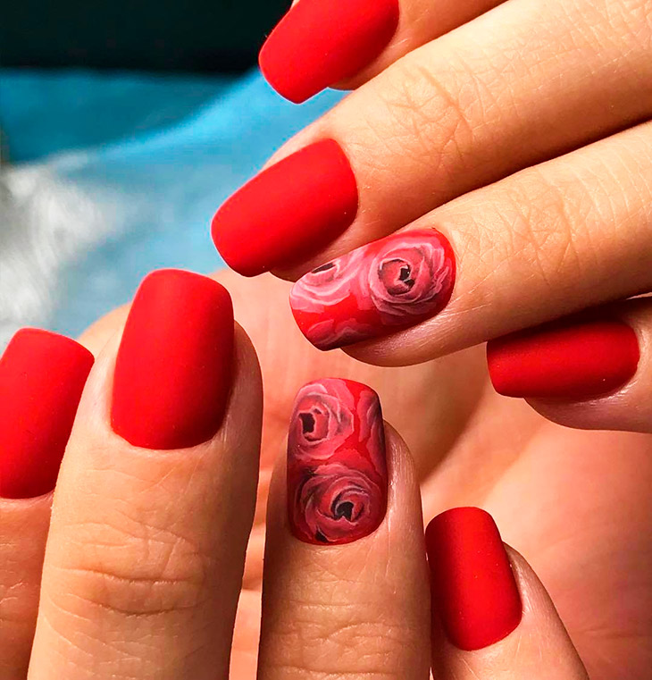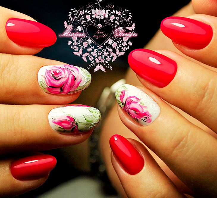 Роза на красном полна символизма и смотрится романтично, она может быть золотой, черной, белой с черным контуром. Розы рисуют на средних ногтях или с другим цветовым акцентом.