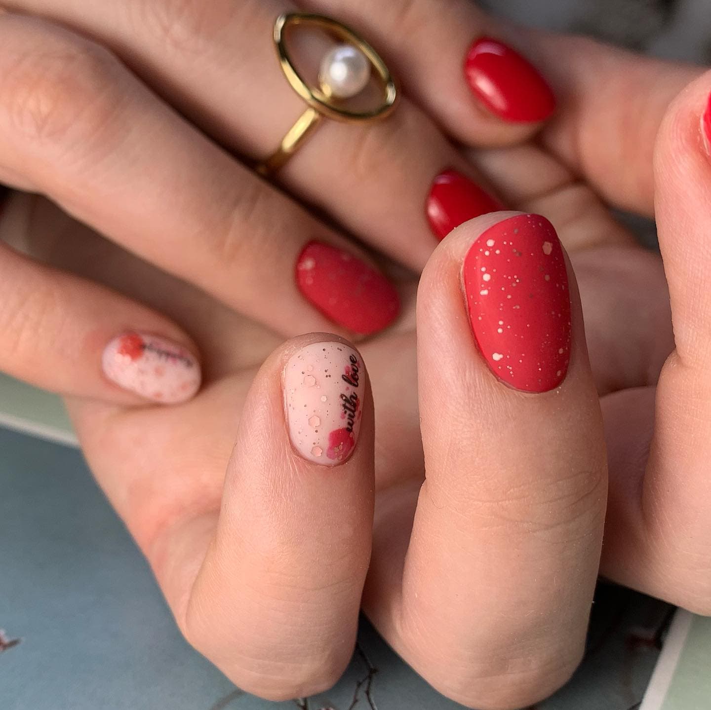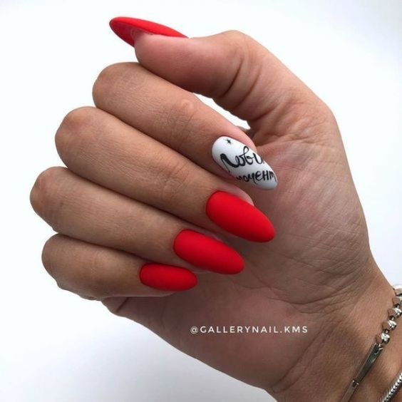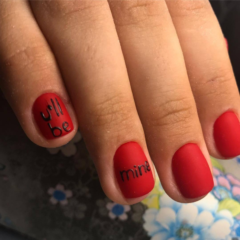 Красный маникюр с надписью