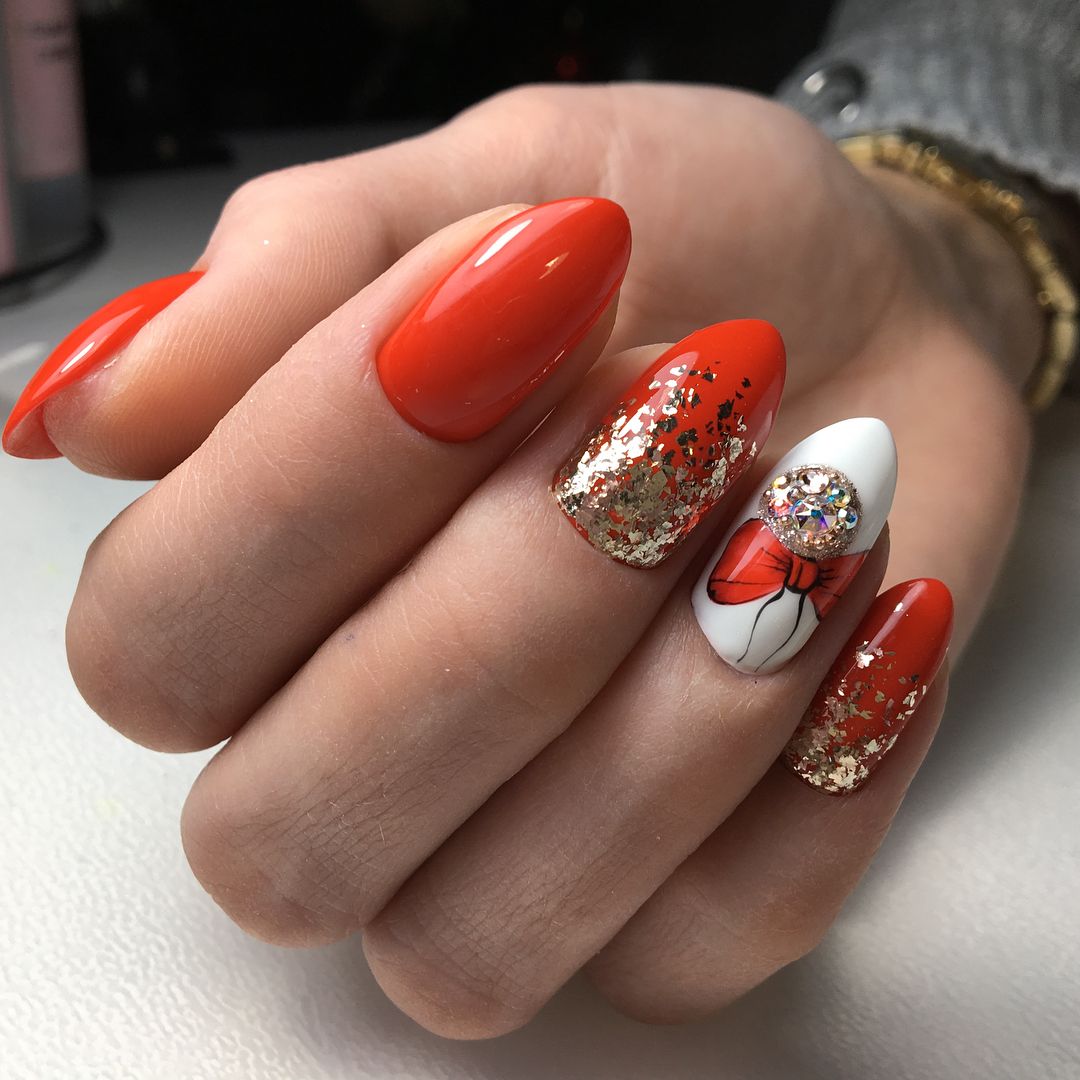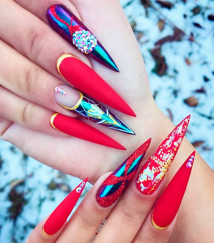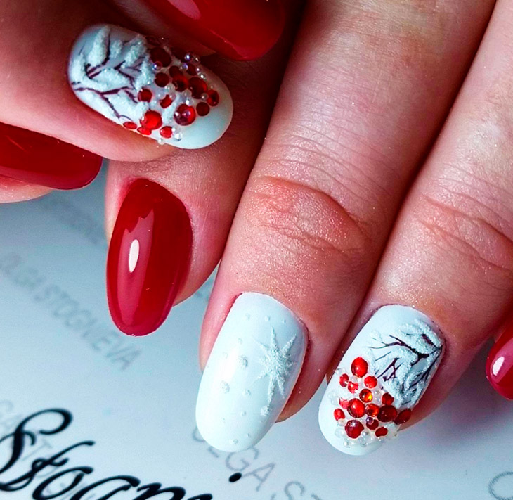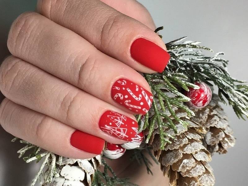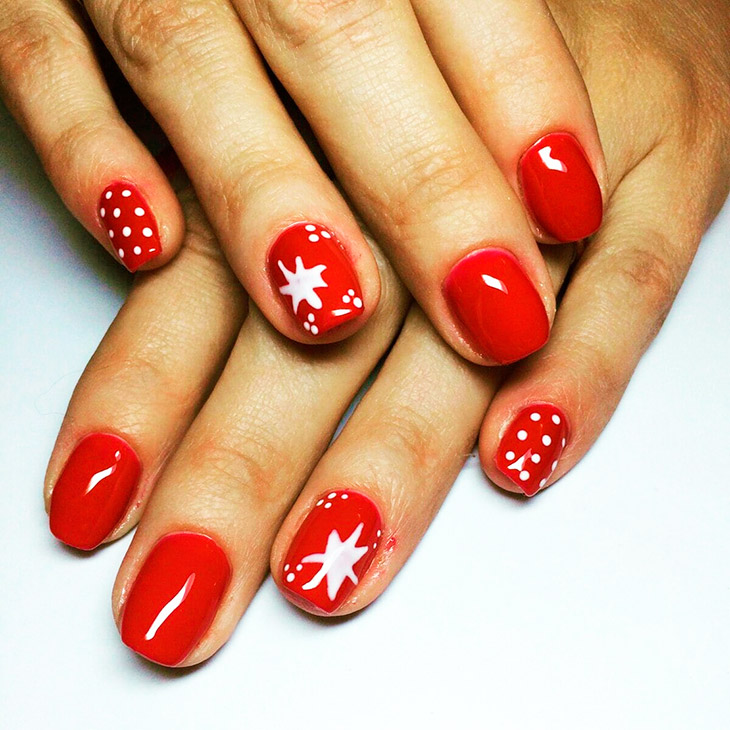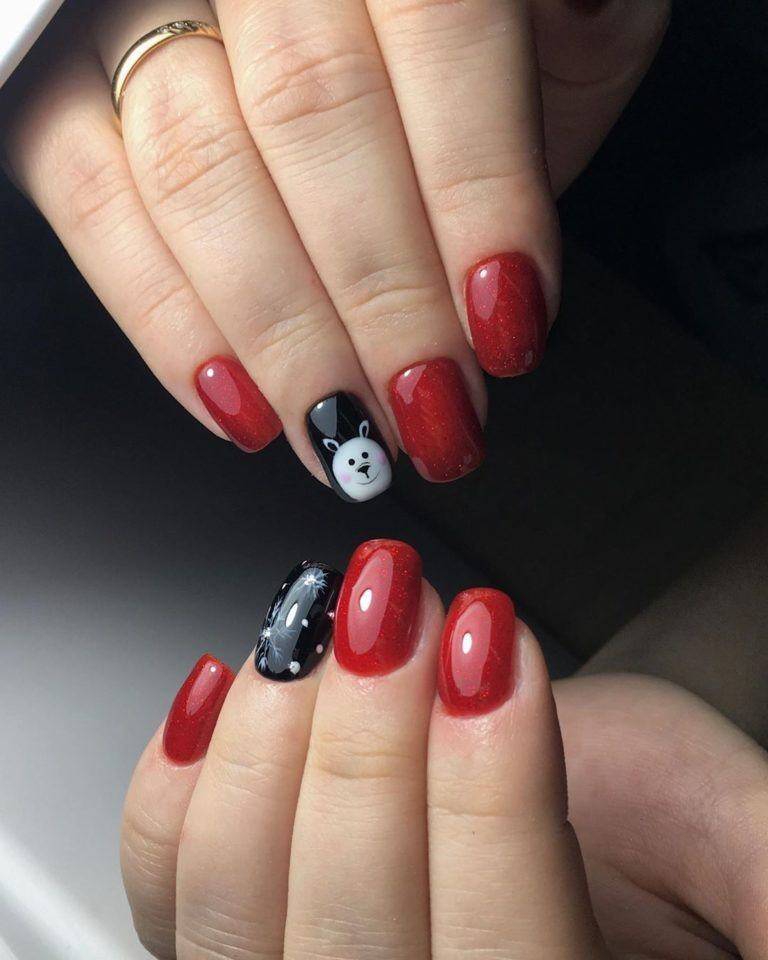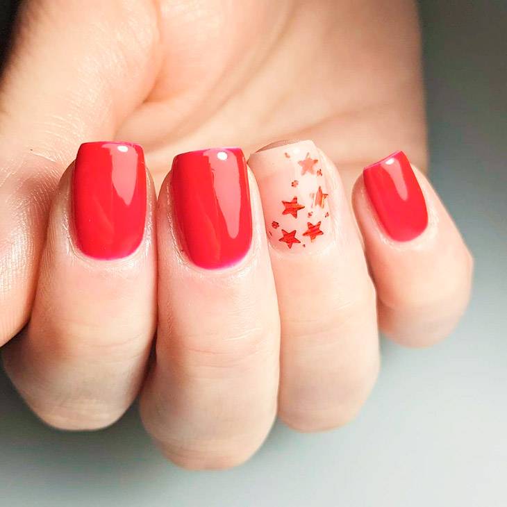 Праздничный маникюр в красном исполнении нередко украшают звездами различного размера и цвета – тут подойдет любой цвет, от белого до золотого, главное, чтобы было сочетание с аксессуарами, а в Новый год смело можно нарушать все законы сочетаний и соответствий.