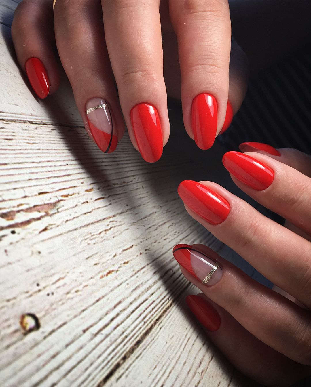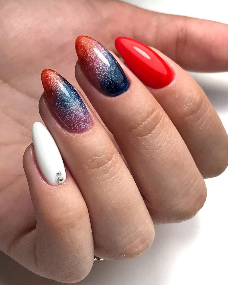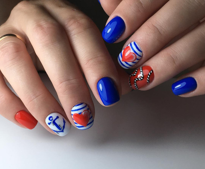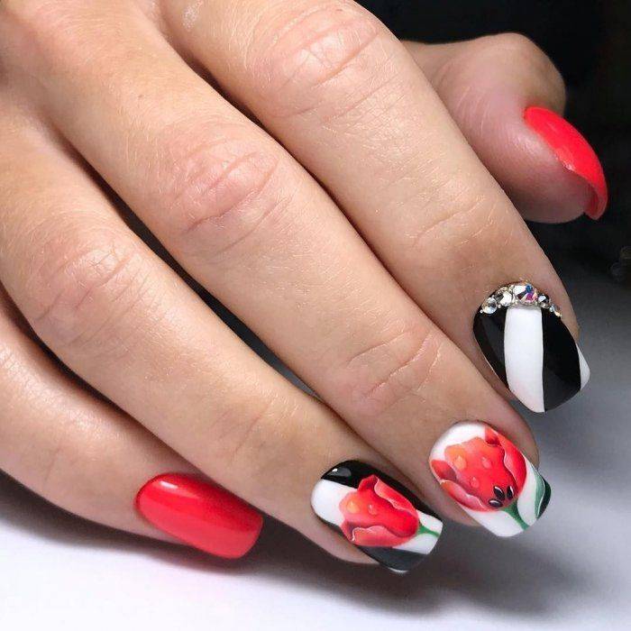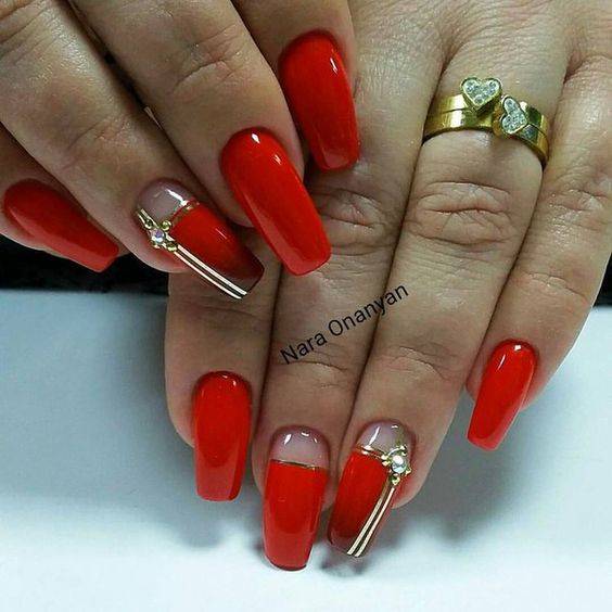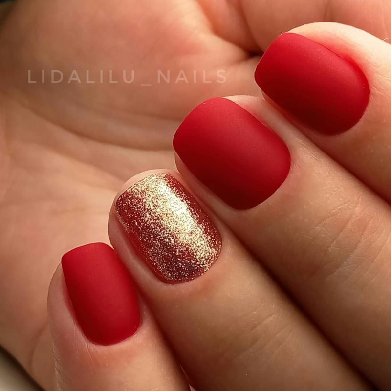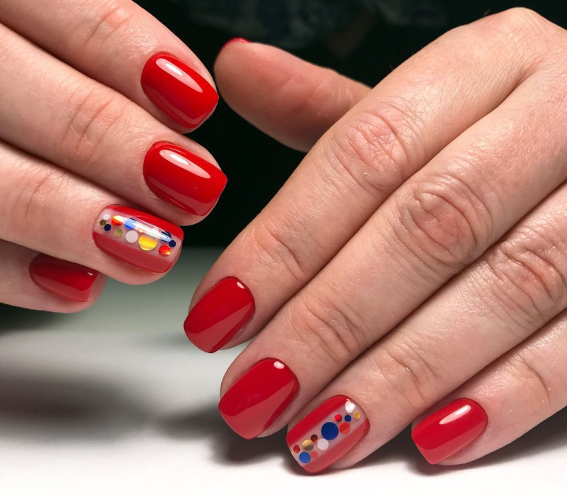 Чтобы маникюр выглядел стильно и изысканно, рекомендуется дополнительно разбавить красный цвет дополнительными оттенками.